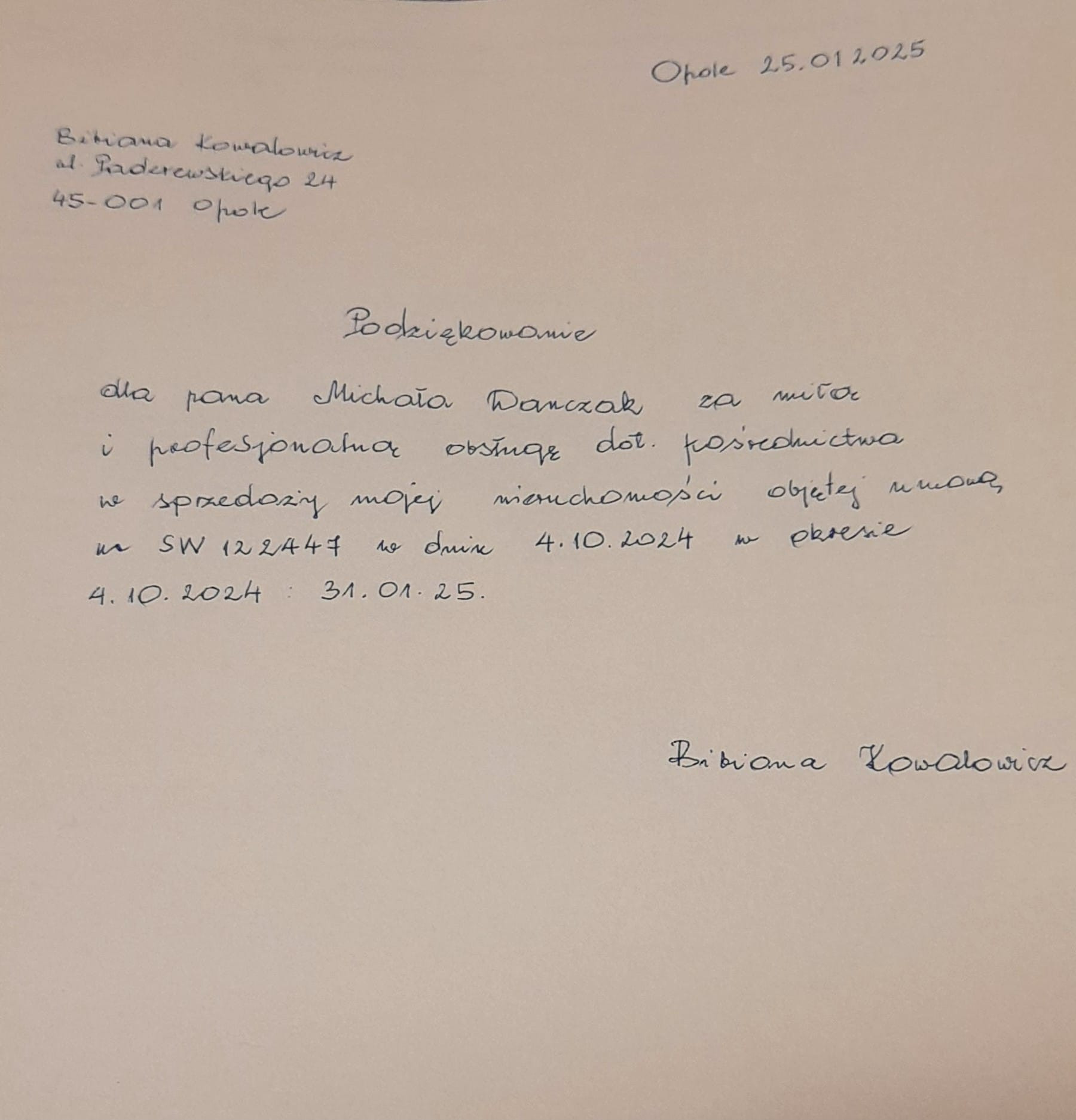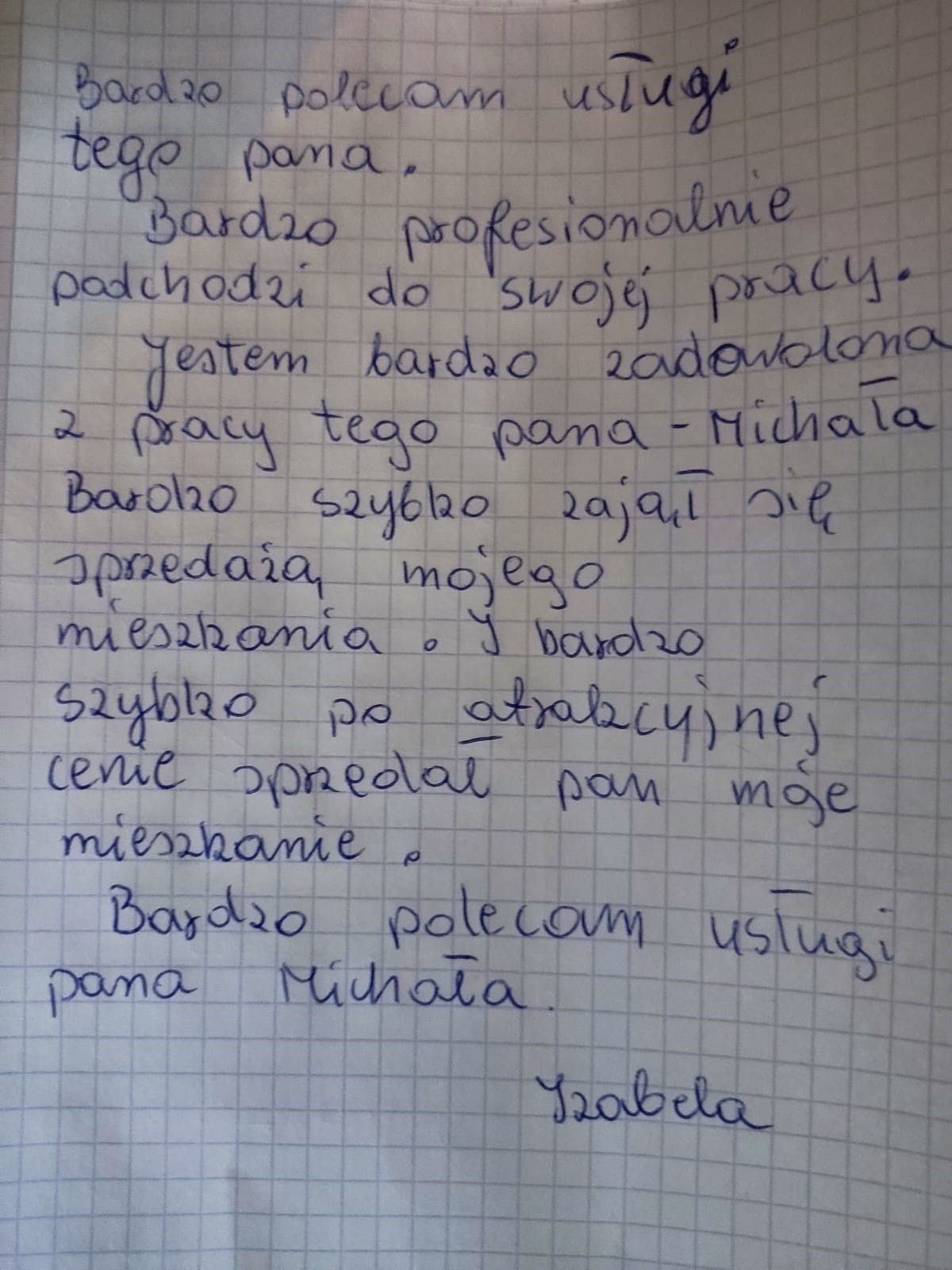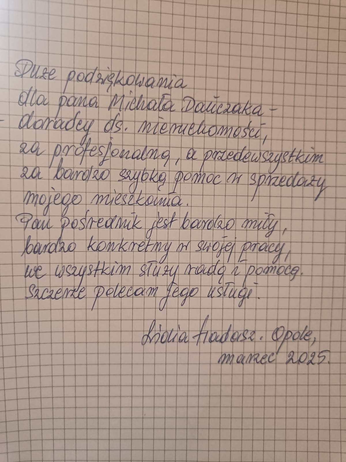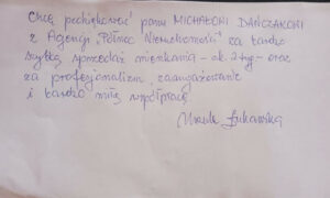 “Chciałam podziękować Panu Michałowi Dańczakowi za prężną współpracę dzięki niemu szybko udało mi się sprzedać mieszkanie choć nasza współpraca trwała krótko bo szybko znalazł mi kupca na mieszkanie w co już zwątpiłam na pewno będę go polecać moim znajomym bo wiem że niedługo będę sprzedawać swoje mieszkania i wiem z całą pewnością że Pan Michał zadziała szybko i skutecznie jeszcze raz dziękuję ”
