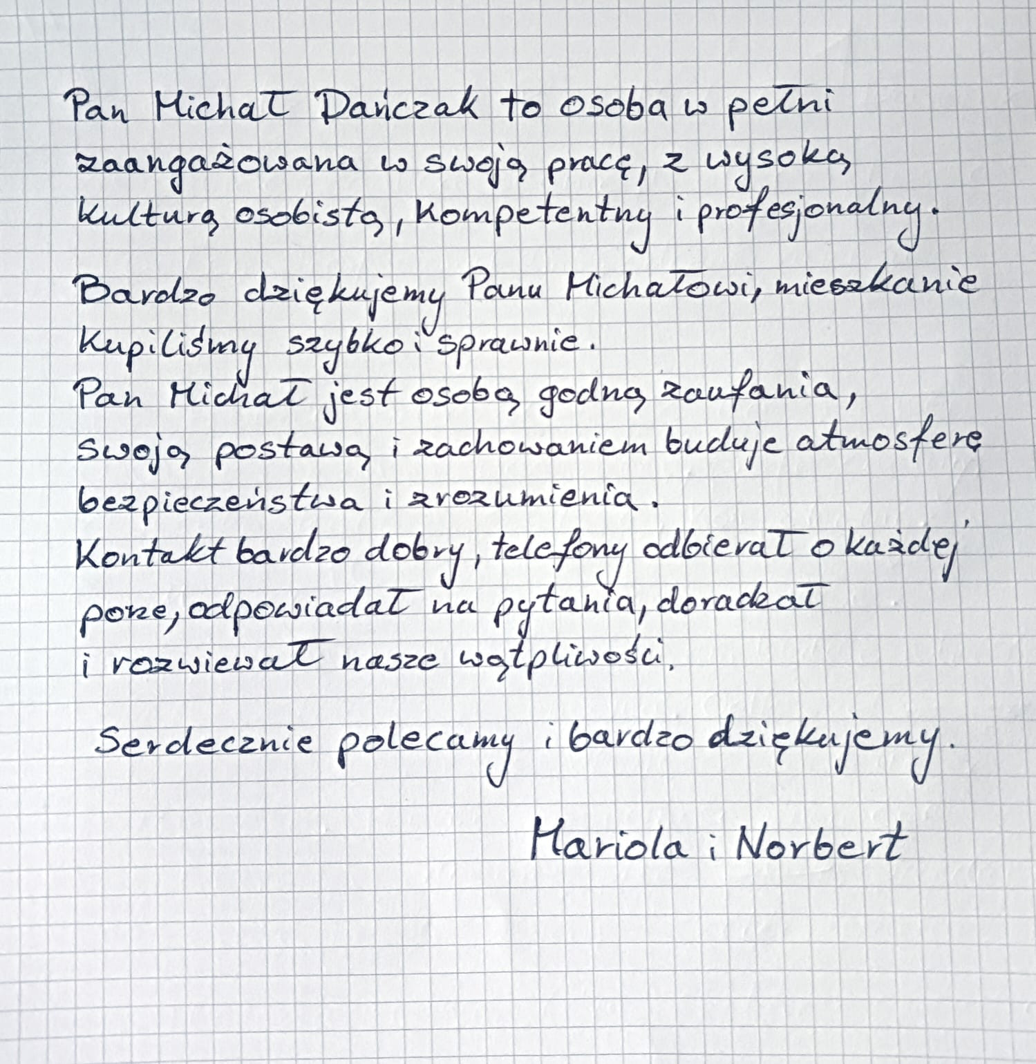 “Pana Michała Dańczaka mogę polecić z czystym sumieniem. Bardzo rzetelna, miła i profesjonalna obsługa. Bardzo dobry kontakt, rzetelne doradztwo, świetny specjalista. Potrzebna dokumentacja sporządzona została z najwyższą starannością. Życzę dalszych sukcesów w sprzedaży mieszkań!”