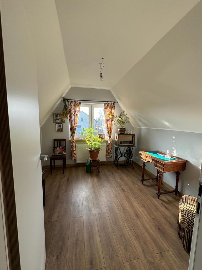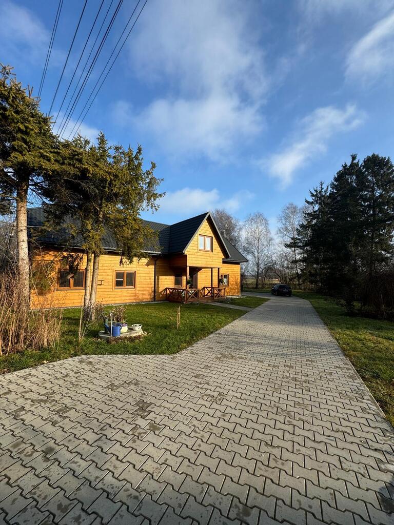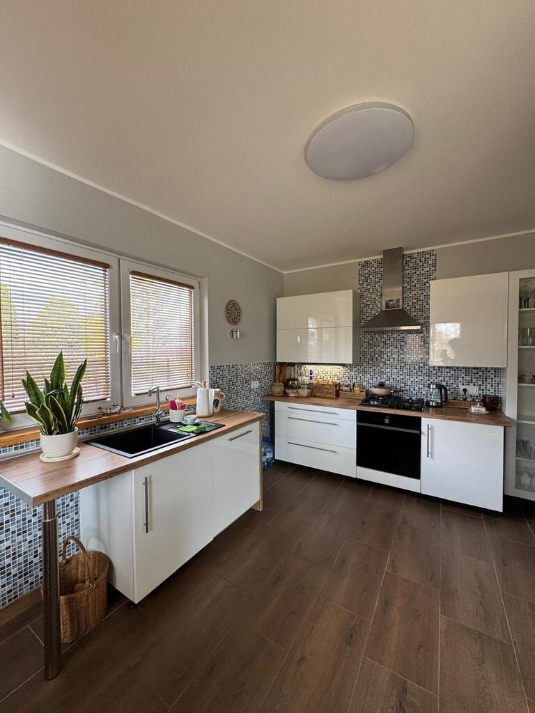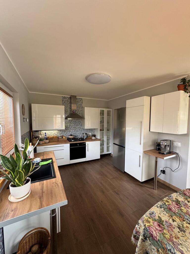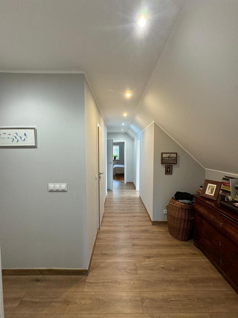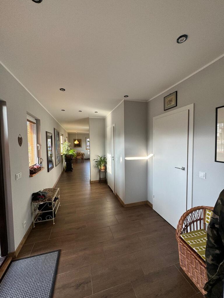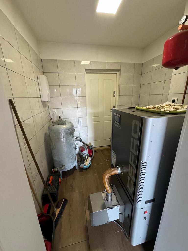 Posiada nową kuchnię , 2 łazienki, pralnię, kotłownię w której znajduje się nowoczesny piec na pellet, firmy Defro. W całym domu jest centralne ogrzewanie , cały parter centralne podłogowe natomiast na piętrze są grzejniki. Woda podgrzewana jest przepływowym nowoczesnym podgrzewaczem wody o dużej mocy( energooszczędny). Woda z wodociągow oraz własna studnia , szambo. prąd/ siła/ W garażu są dwa miejsca na samochody osobowe, garaż posiada 2 bramy wjazdowe, jest również miejsce na mały warsztacik . Cisza, spokój i natura.
