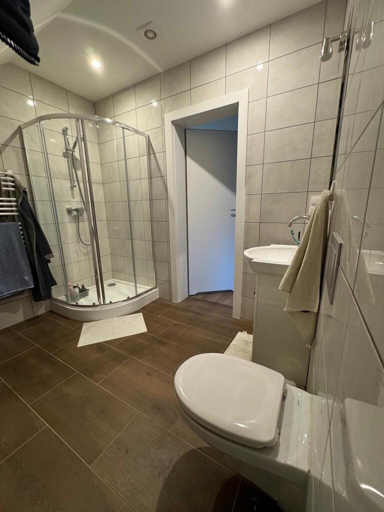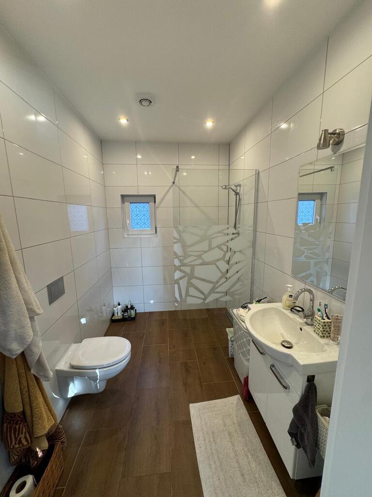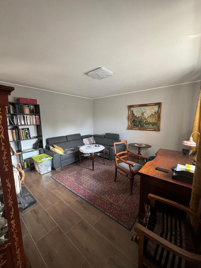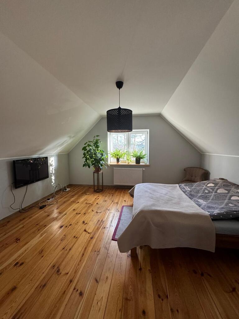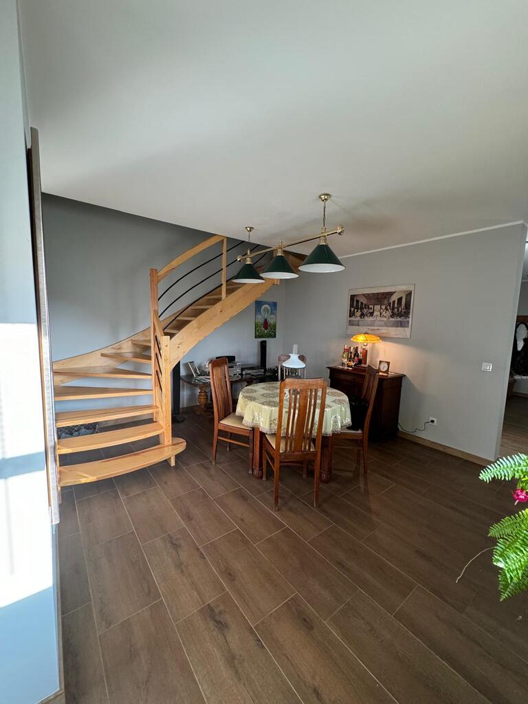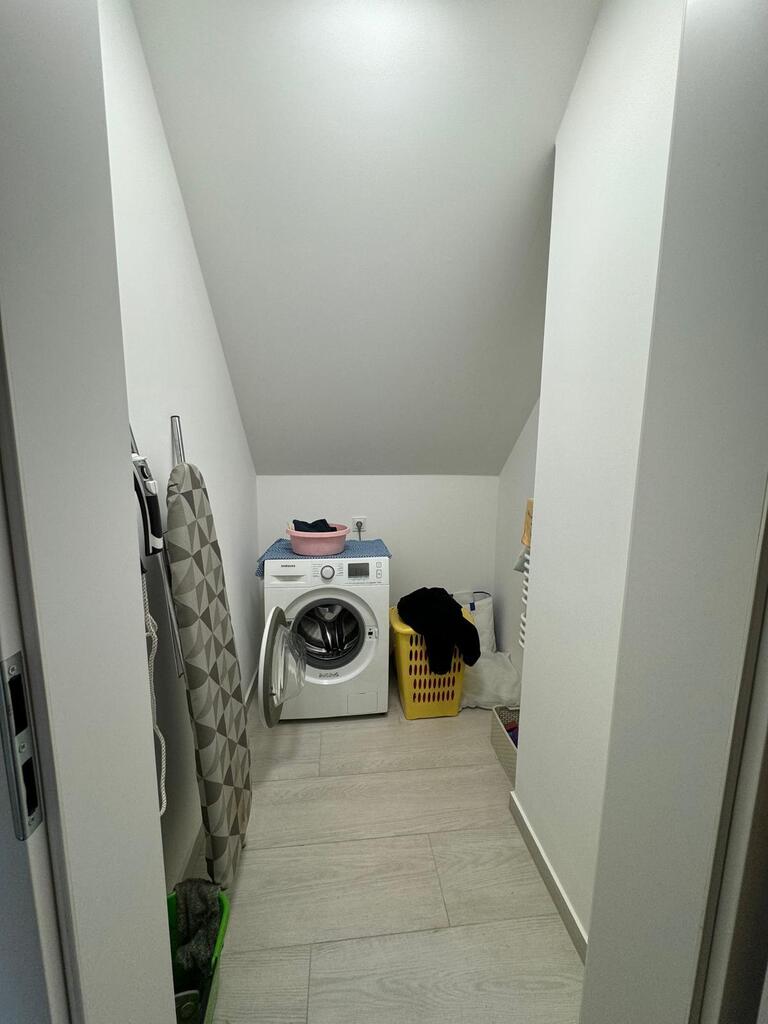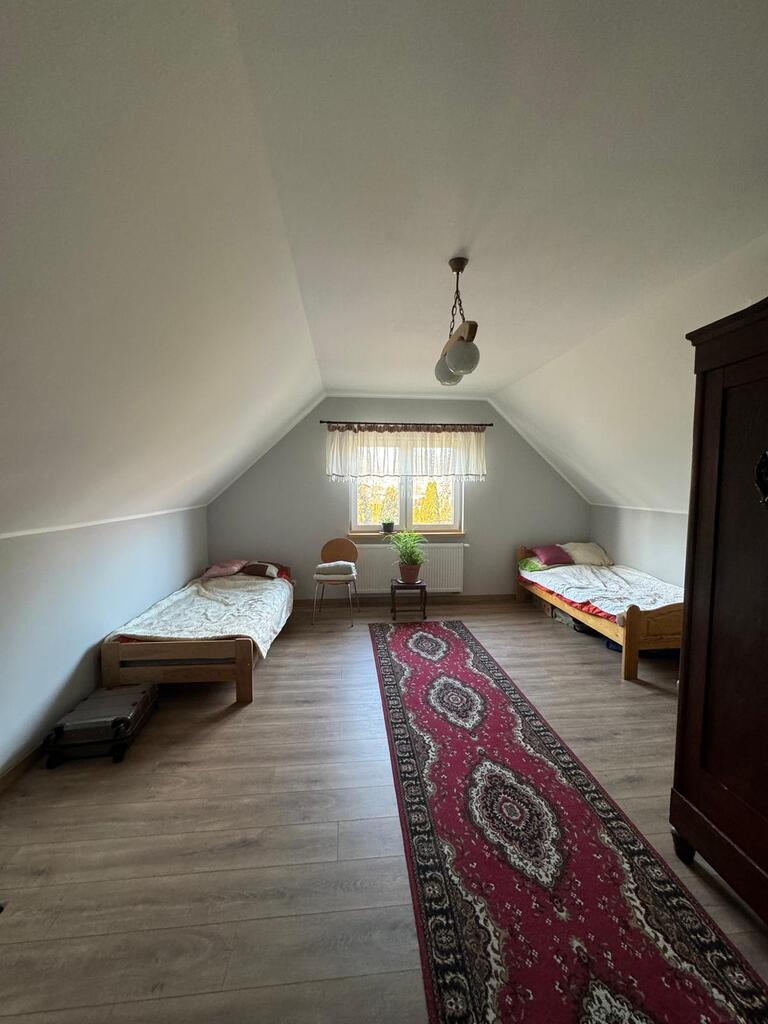 Posiada nową kuchnię , 2 łazienki, pralnię, kotłownię w której znajduje się nowoczesny piec na pellet, firmy Defro. W całym domu jest centralne ogrzewanie , cały parter centralne podłogowe natomiast na piętrze są grzejniki. Woda podgrzewana jest przepływowym nowoczesnym podgrzewaczem wody o dużej mocy( energooszczędny). Woda z wodociągow oraz własna studnia , szambo. prąd/ siła/ W garażu są dwa miejsca na samochody osobowe, garaż posiada 2 bramy wjazdowe, jest również miejsce na mały warsztacik . Cisza, spokój i natura.