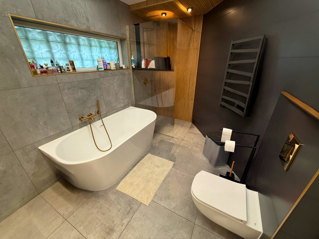 - Łazienka z wanną, prysznicem i zsypem do pralni w piwnicy