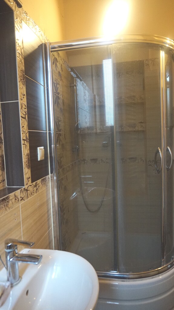 - łazienka: prysznic, WC, umywalka, ceramika na ścianach i podłodze