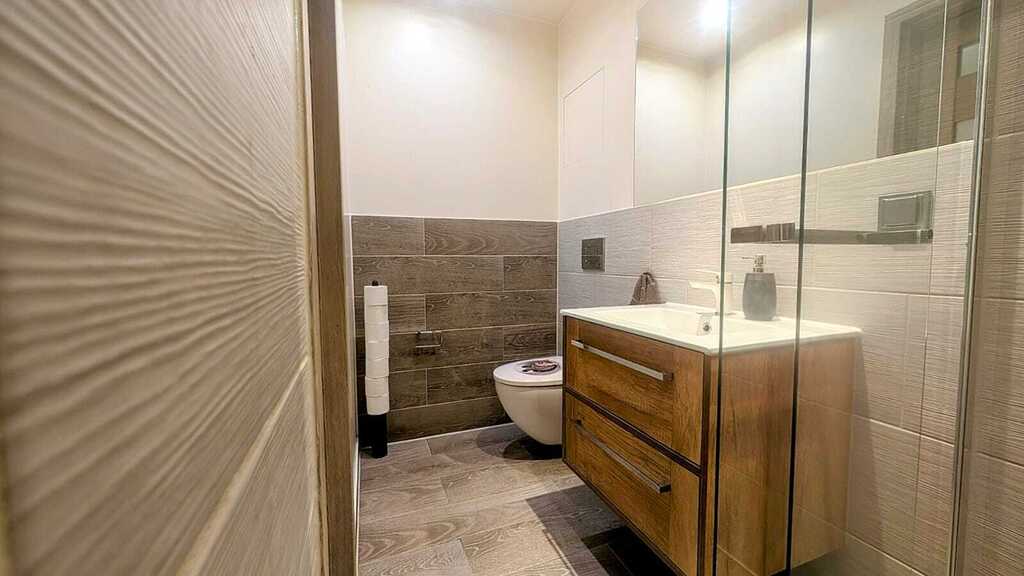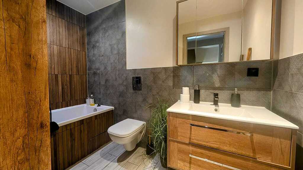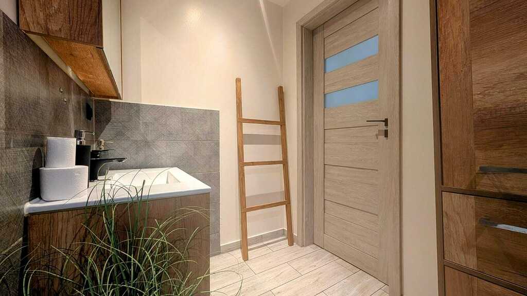 Wyposażenie: kuchnia w pełni umeblowana i wyposażona w sprzęt AGD, łazienka z wanną oraz łazienka z prysznicem