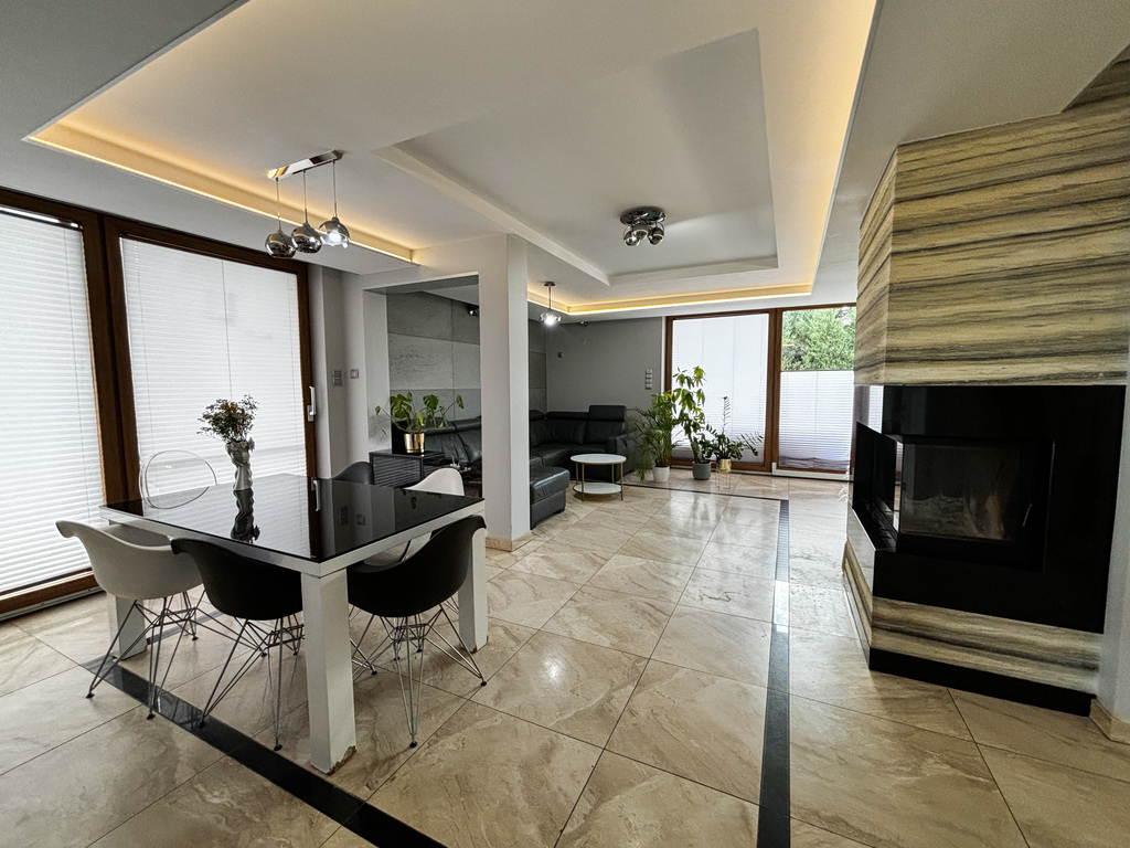 - Przestronny salon z dużymi przeszkleniami z bezpośrednim wyjściem na taras i do ogrodu, z kominkiem wyposażonym w płaszcz wodny i klimatyzacją oraz wydzieloną jadalnią (34,43 m2)