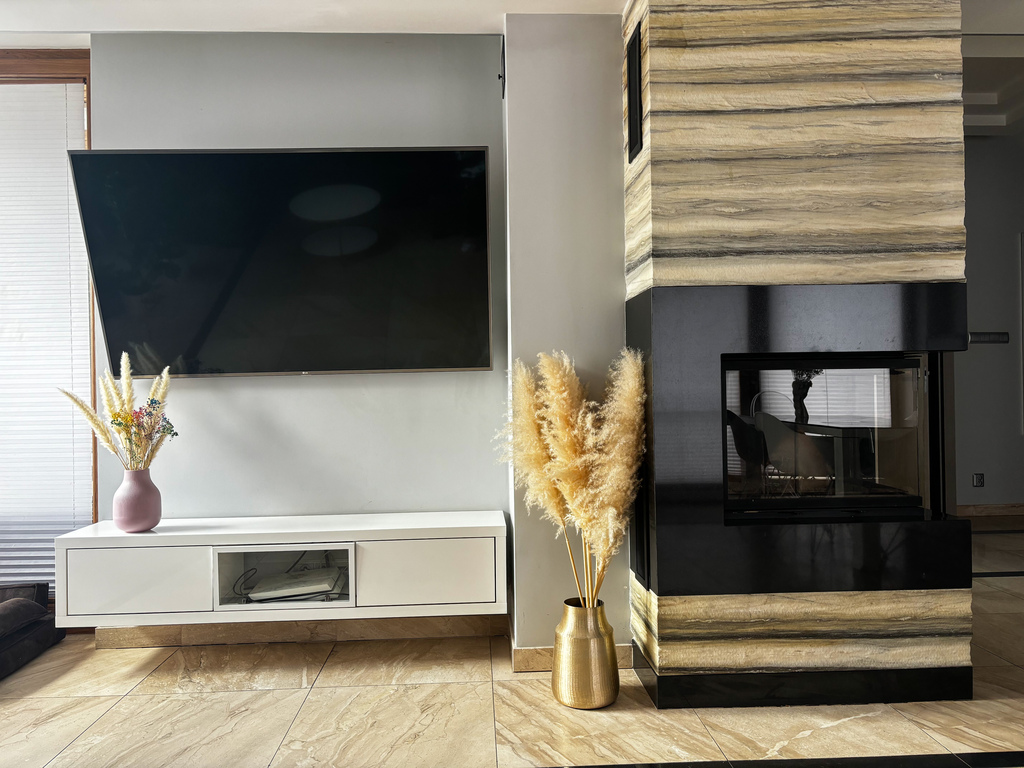 - W salonie kominek z płaszczem wodnym (rozprowadzenie ciepła po podłogach oraz kaloryferach)