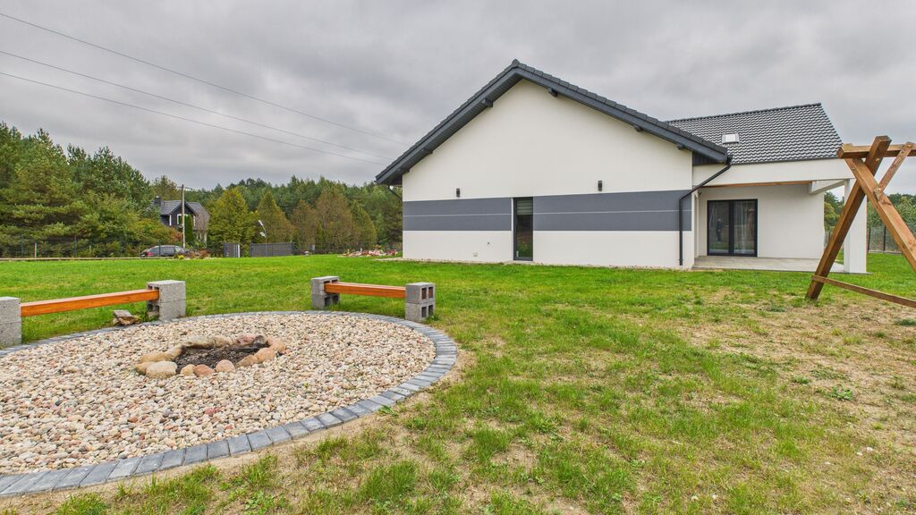 55 x 45 m daje dużo przestrzeni na ognisko, altanę, miejsce do zabawy dla dzieci czy uprawianie własnych warzyw w ogrodzie.