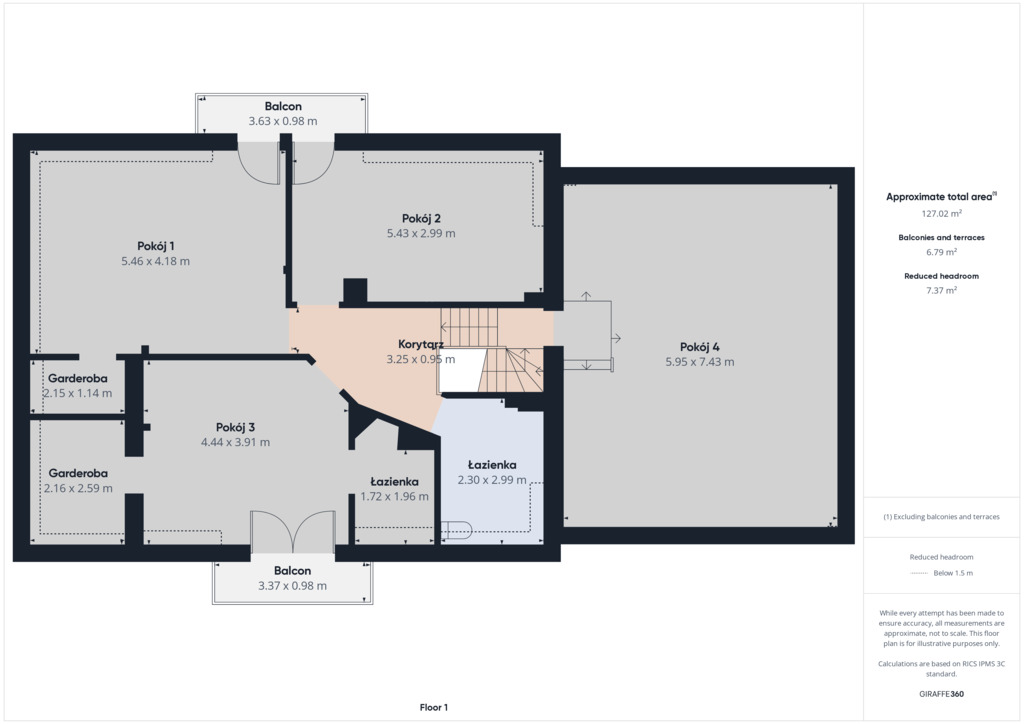 Pokój – 15,80 m2(17,30m2) + Łazienka – 2,30 m2(3,80m2) + Garderoba – 2,70 m2(6,00m2)