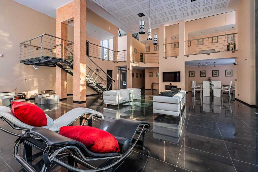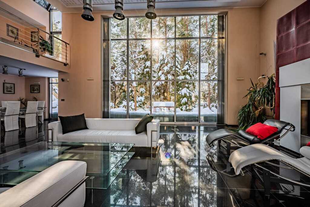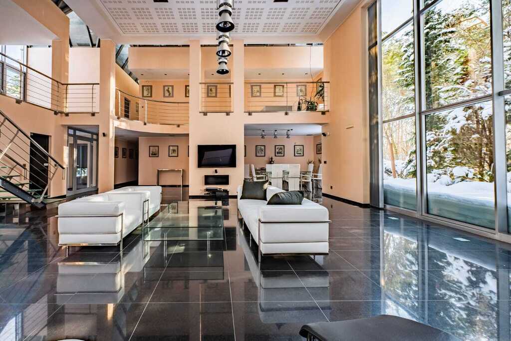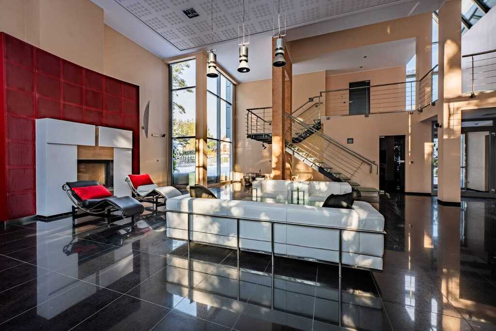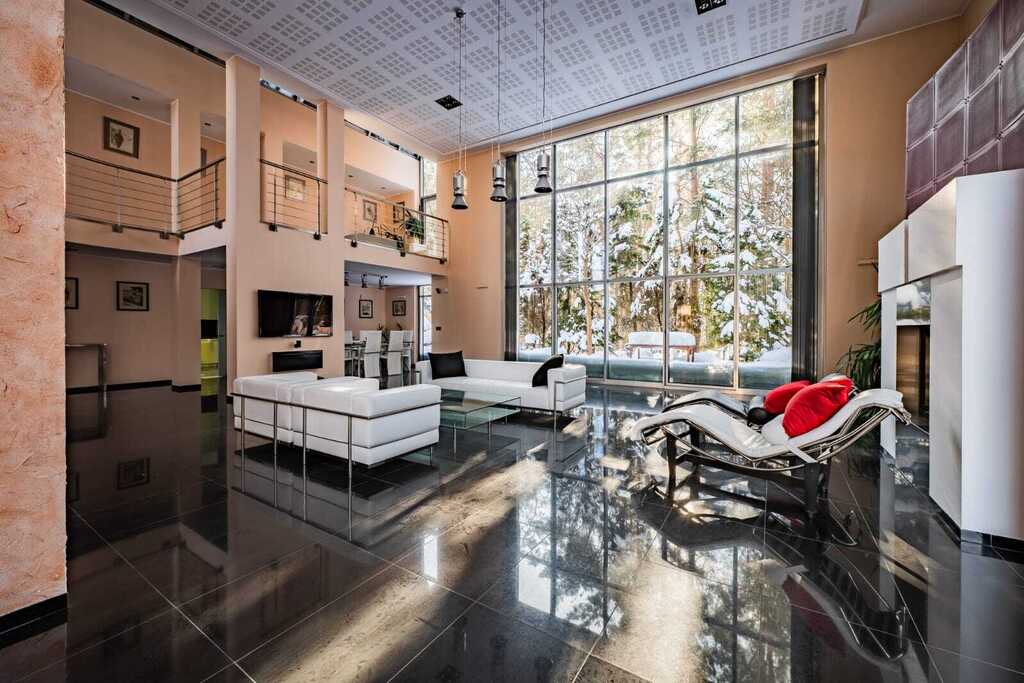 Sercem rezydencji jest imponujący, otwarty salon z kominkiem, połączony z kuchnią zaprojektowaną na indywidualne zamówienie. Wysokość salonu sięgająca połaci dachowej oraz ogromne przeszklenia nadają wnętrzu wyjątkową przestronność, jasność i reprezentacyjny charakter.