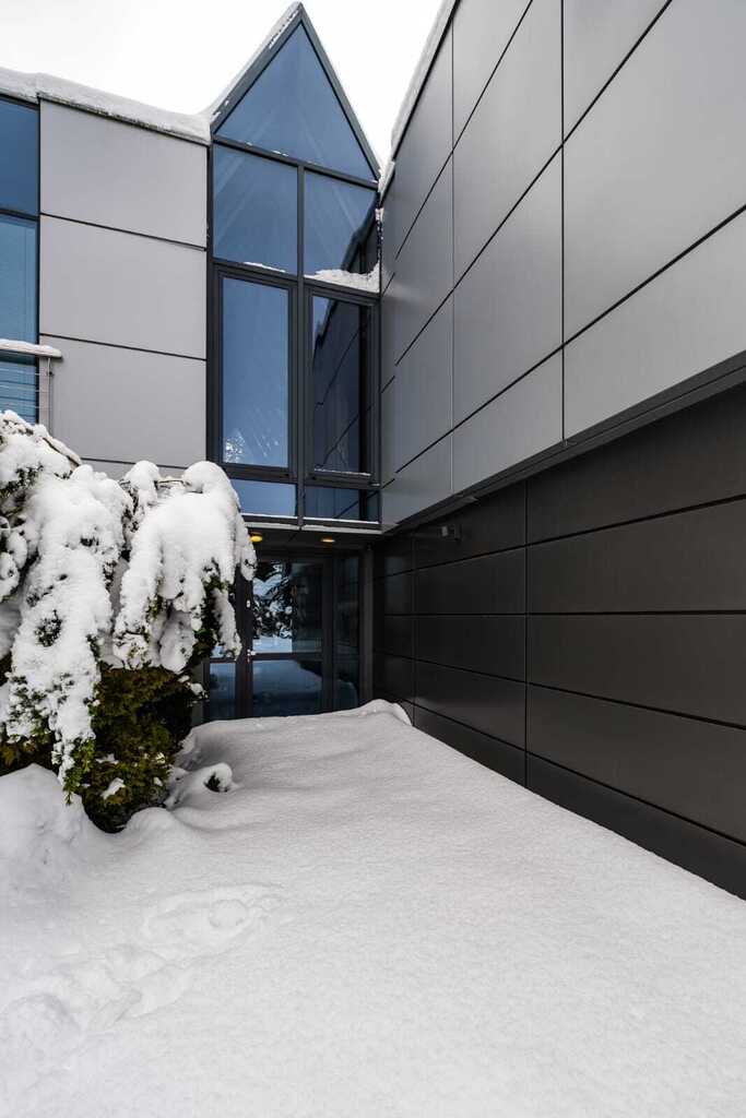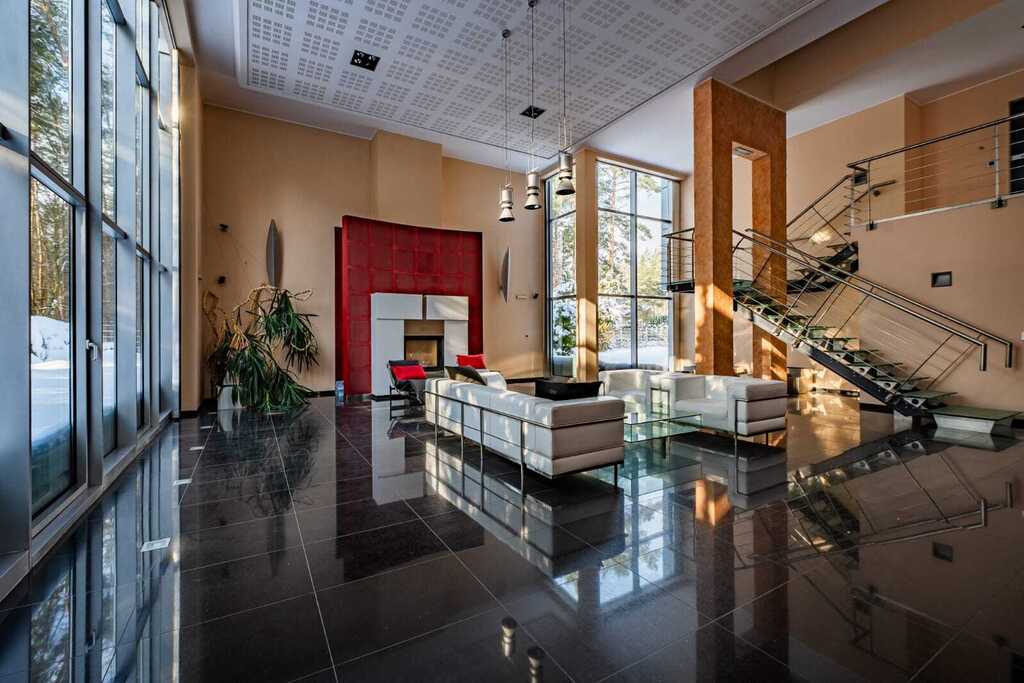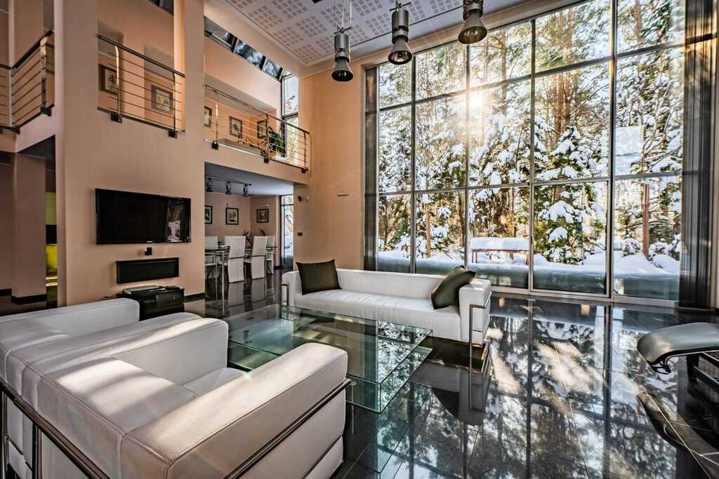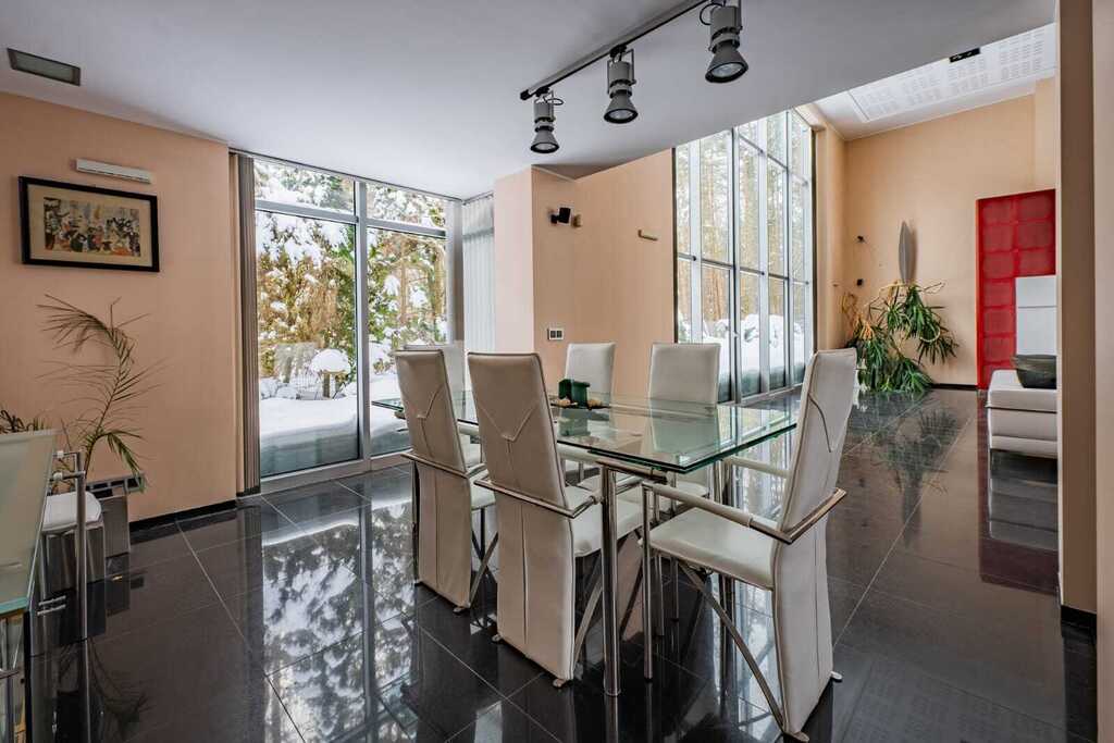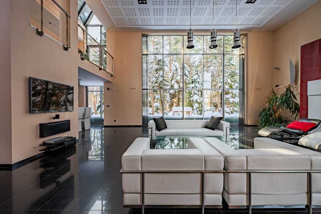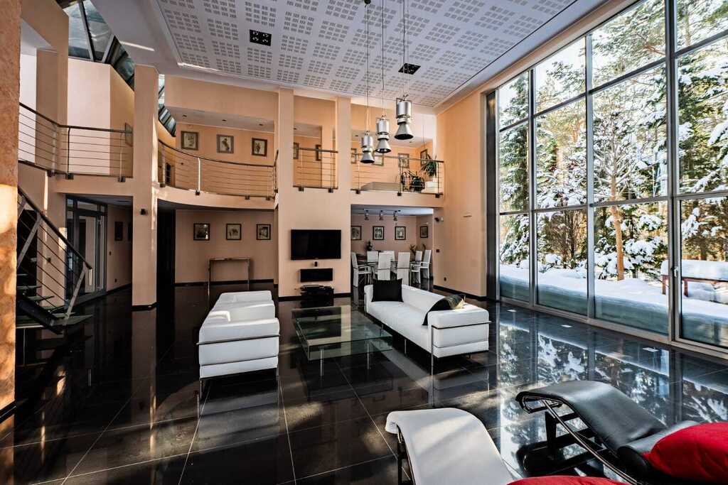 Sercem rezydencji jest imponujący, otwarty salon z kominkiem, połączony z kuchnią zaprojektowaną na indywidualne zamówienie. Wysokość salonu sięgająca połaci dachowej oraz ogromne przeszklenia nadają wnętrzu wyjątkową przestronność, jasność i reprezentacyjny charakter.