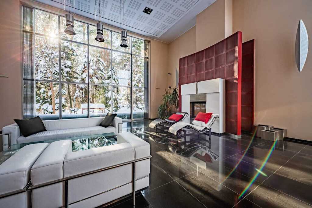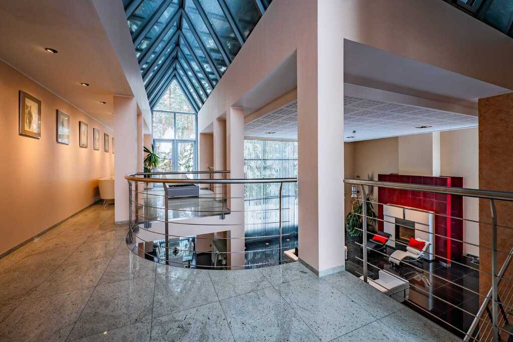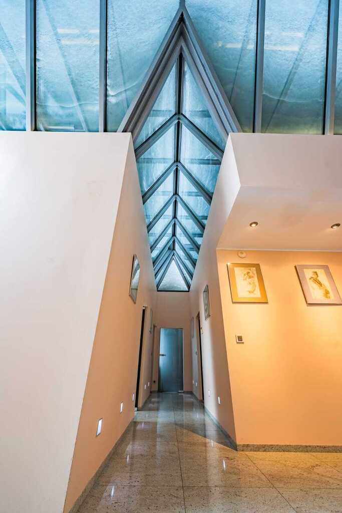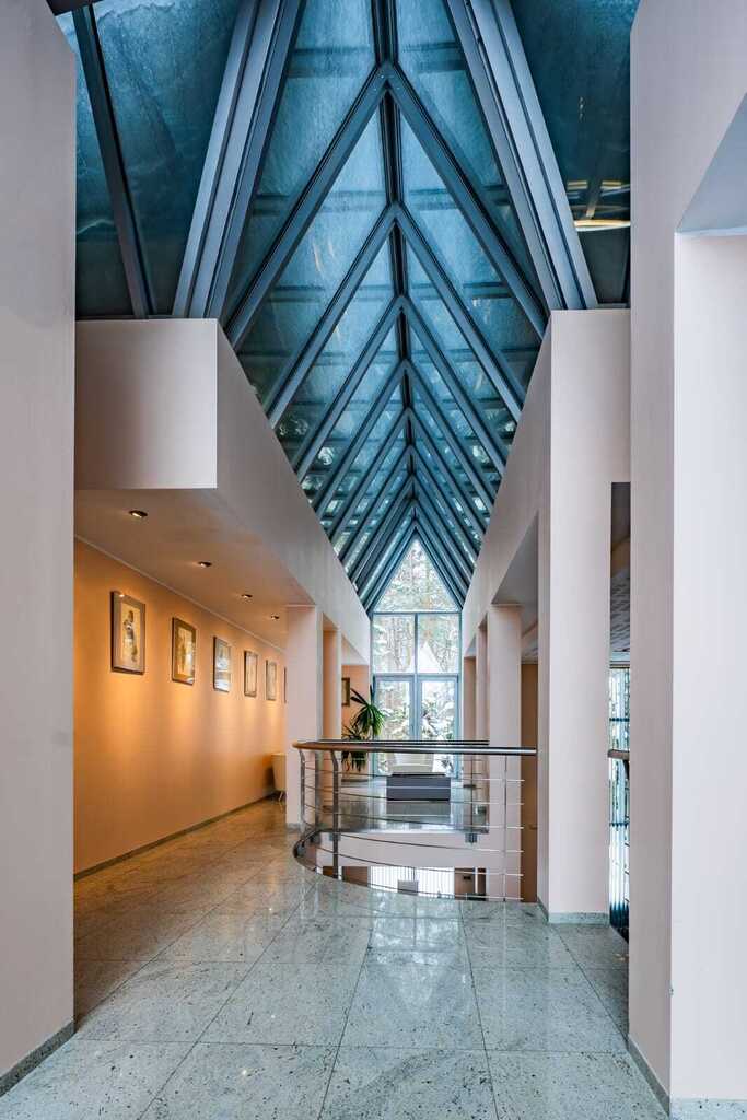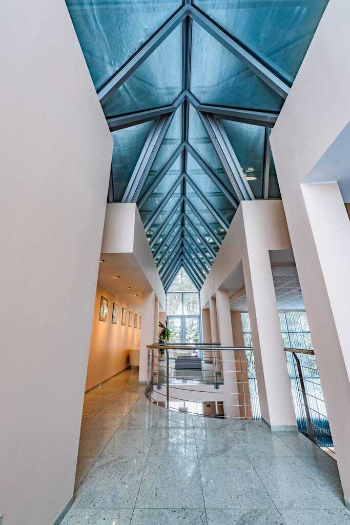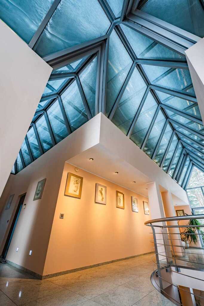 Nowoczesna konstrukcja dachu oraz liczne przeszklenia tworzą niezwykłe efekty świetlne o różnych porach dnia, nadając wnętrzu niepowtarzalny klimat.