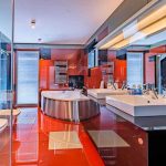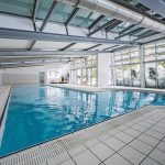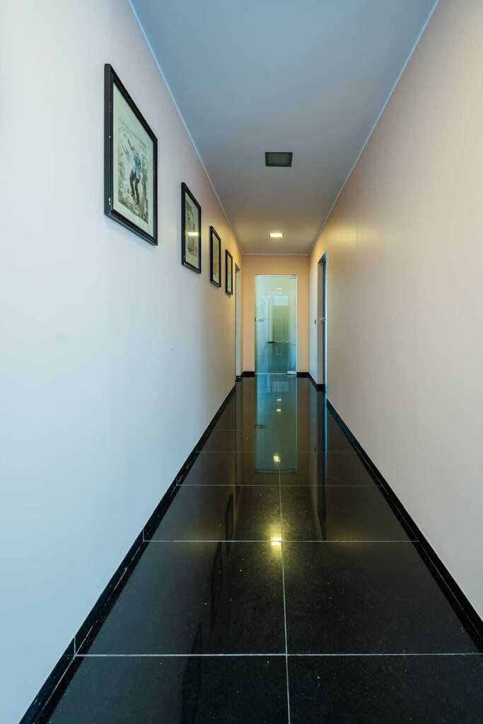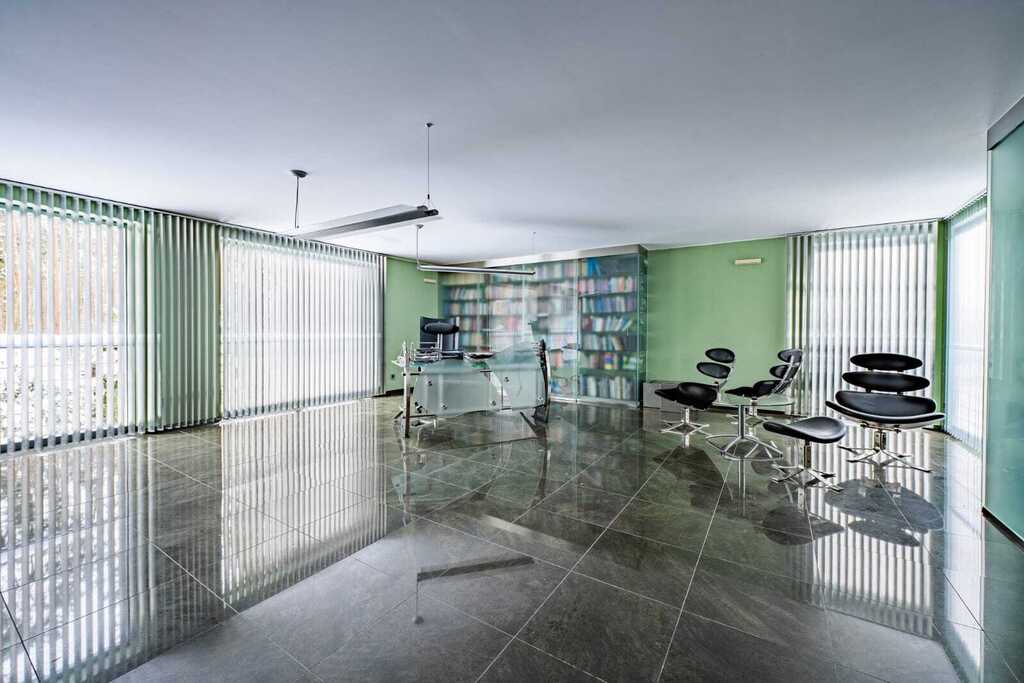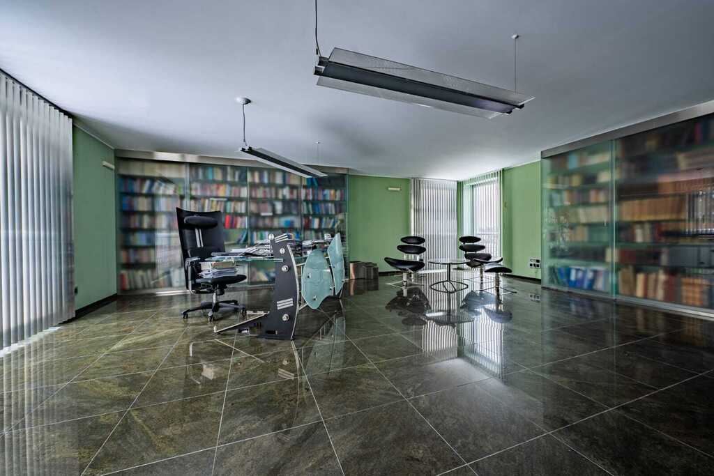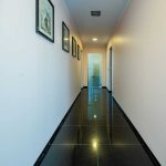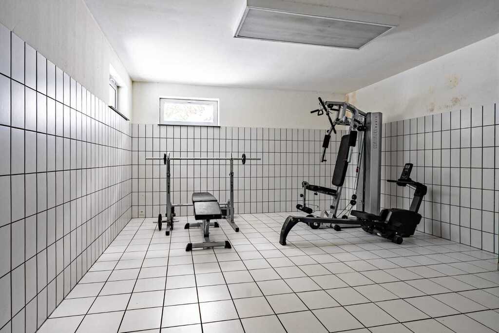 Podziemny hol łączący część mieszkalną z basenem oferuje dodatkowe pomieszczenia, takie jak siłownia, łazienka czy WC.