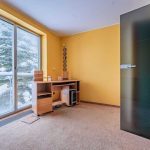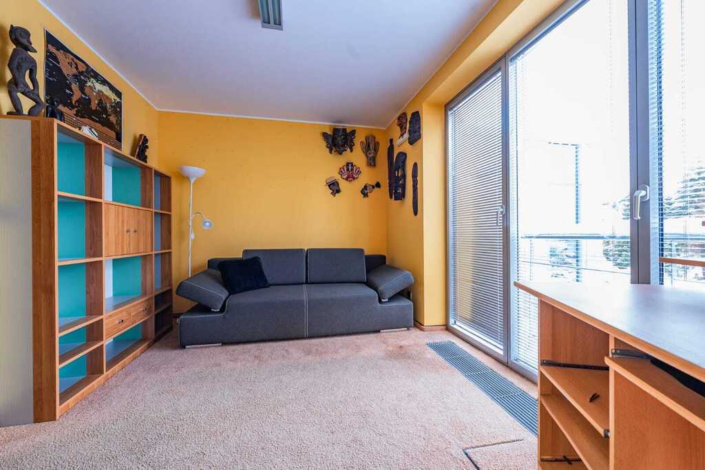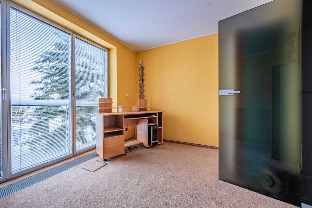 Na piętrze mieści się gabinet z biblioteką – idealne miejsce do pracy lub relaksu – z dużymi przeszkleniami i widokiem na las.