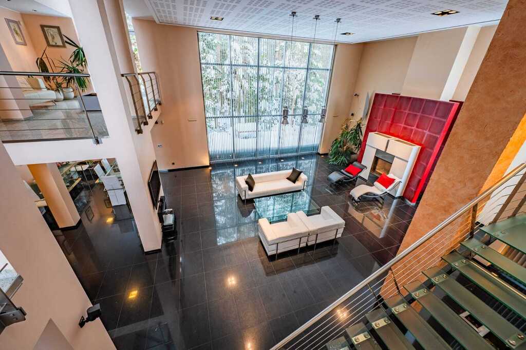 Widoki rozpościerające się z antresoli potęgują wrażenie przestrzeni i podkreślają unikatowy charakter rezydencji, a naturalne światło wpadające przez duże okna sprzyja relaksowi i doskonale wpływa na samopoczucie domowników.