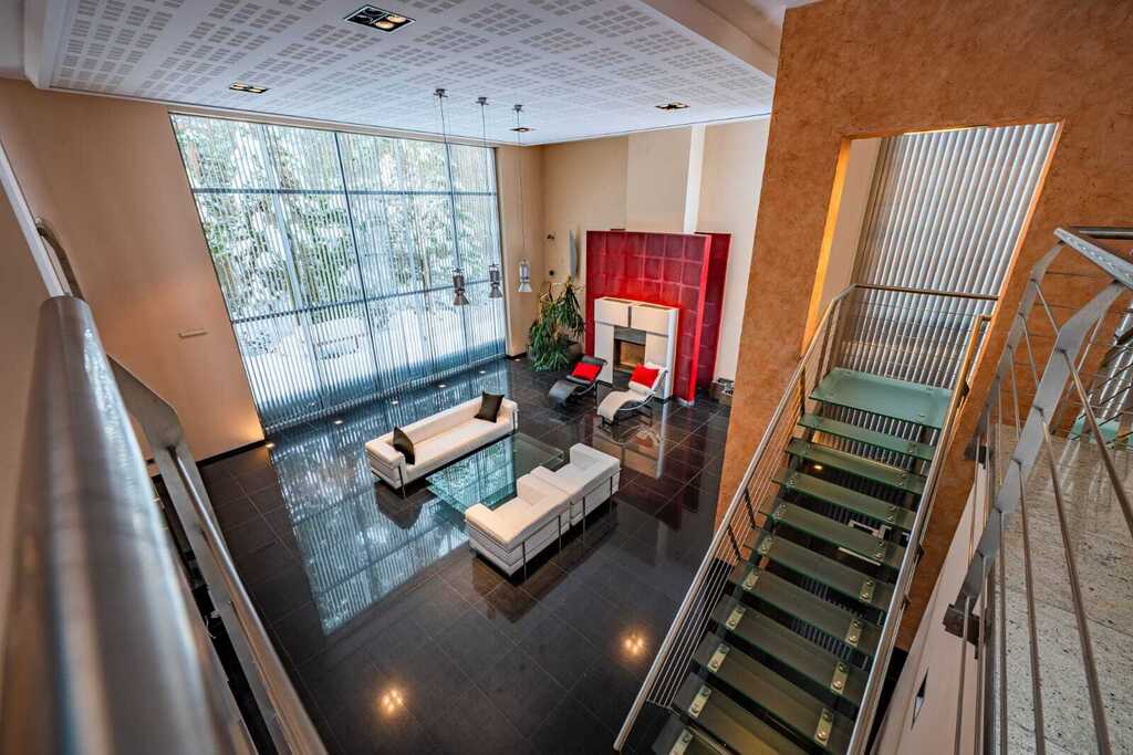 Z górnej kondygnacji rozpościera się widok na salon i jego spektakularną przestrzeń.
