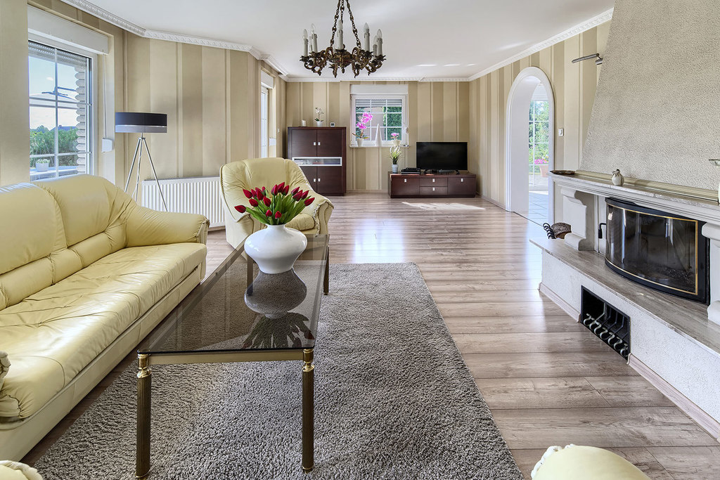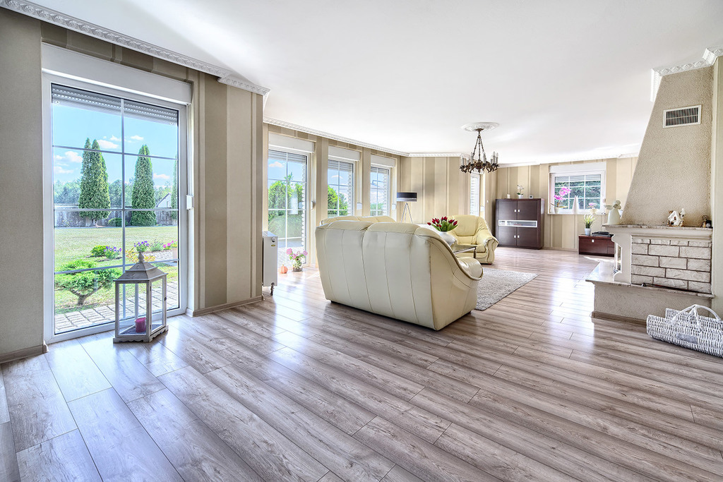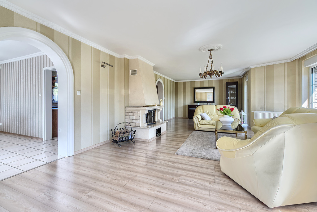 - salon z kominkiem z wyjściem na taras i ogród (43,6 m2)