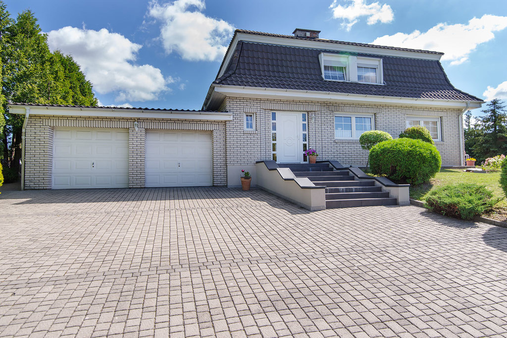 Podjazd do garażu i taras narożny (dwustronny) wyłożony kostką brukową.