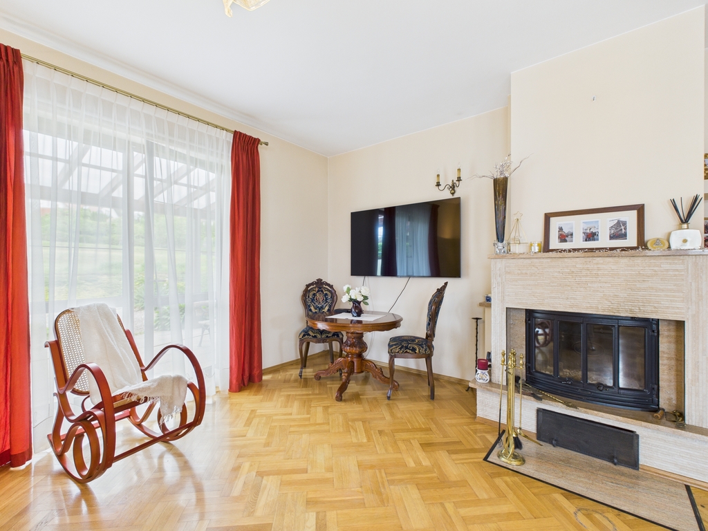 - salon z kominkiem i wyjściem na duży, zadaszony taras