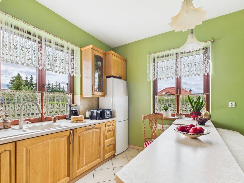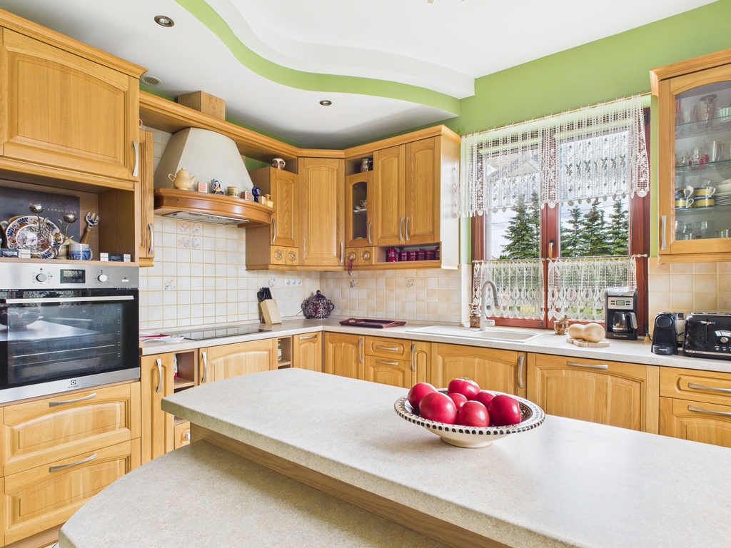 - kuchnia z oknem w zabudowie, z kompletnym, wysokiej klasy sprzętem AGD