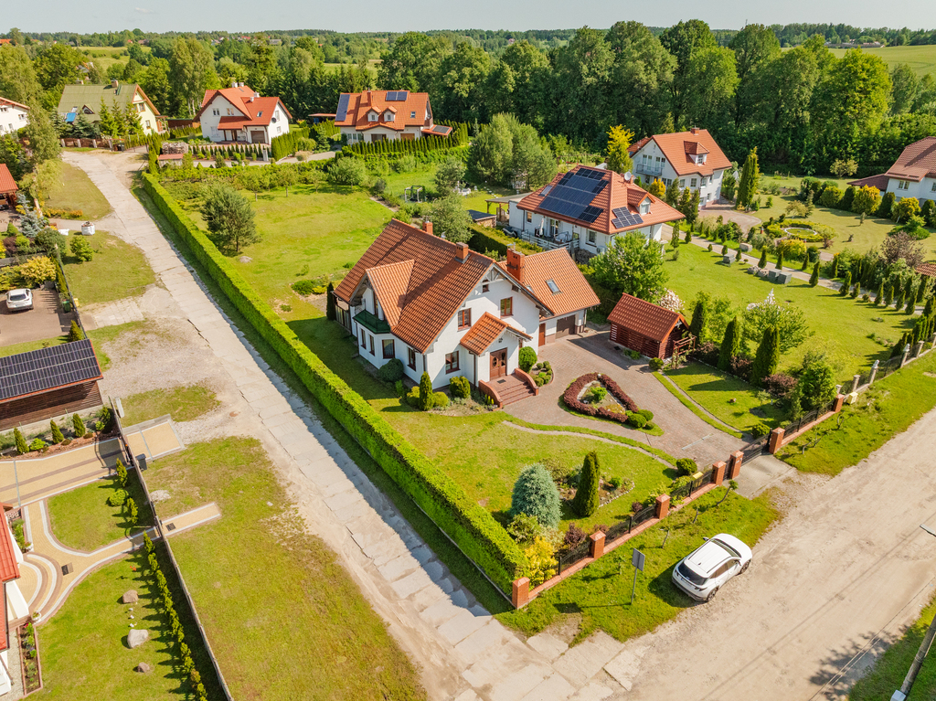 Powierzchnia starannie zagospodarowanej działki (2 027 m²) jest całkowicie ogrodzona.