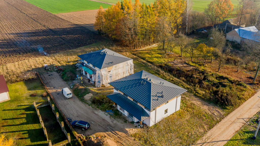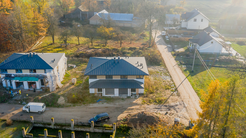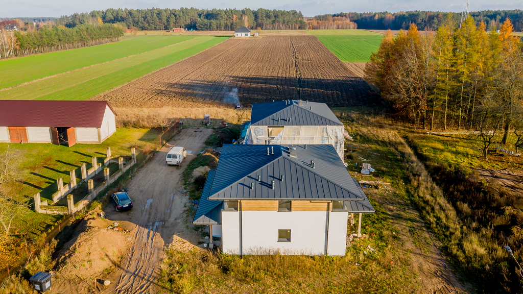 Dach wykonany z blachy płaskiej zapewnia trwałość i ochronę przed warunkami atmosferycznymi.