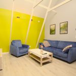 - Pokój wypoczynkowy z sofą rozkładaną, fotelem i TV