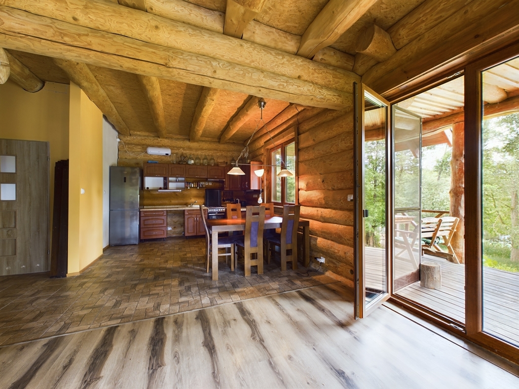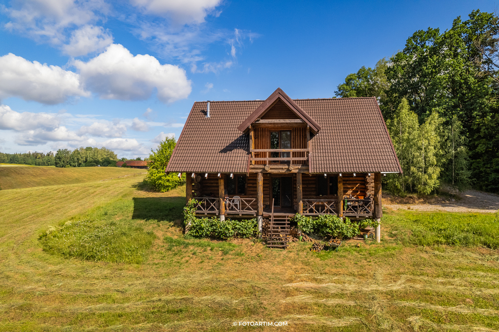 Na działce o powierzchni 1,2 HA, lekko pochylonej stronę jeziora Karwik znajduje się dom z bala.