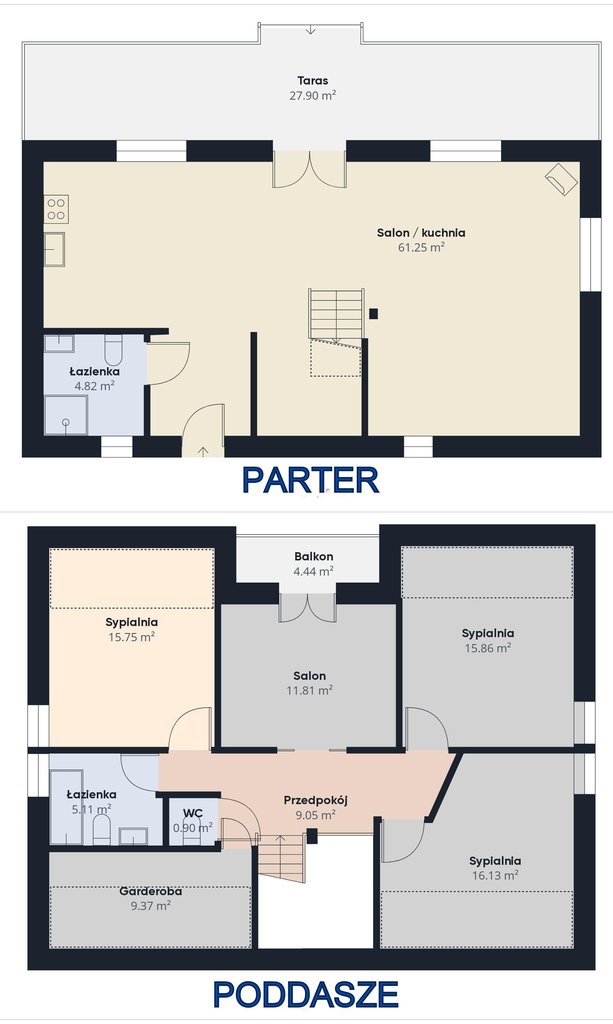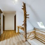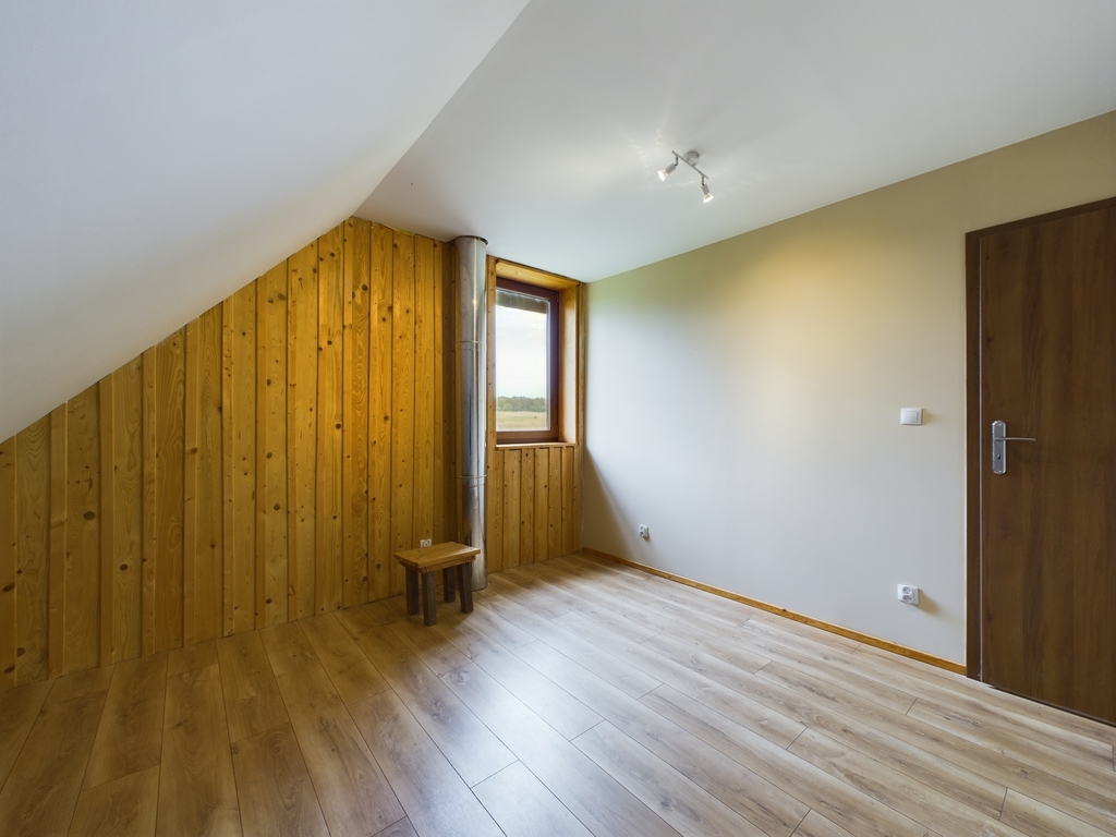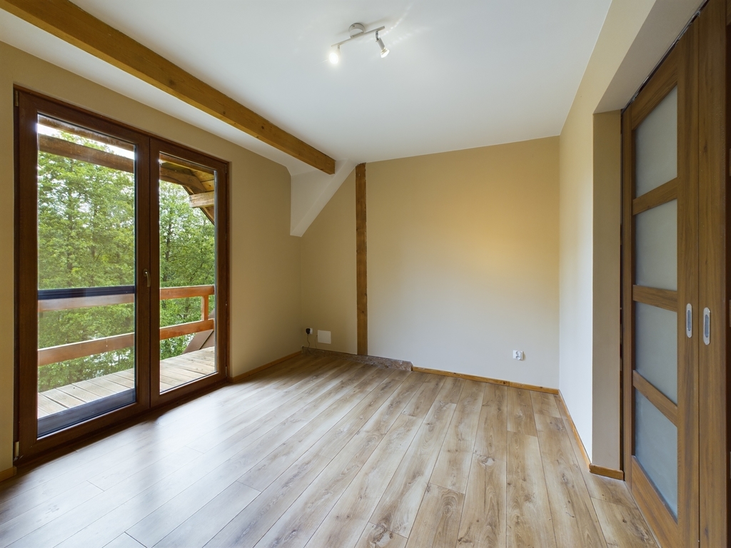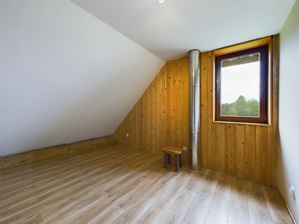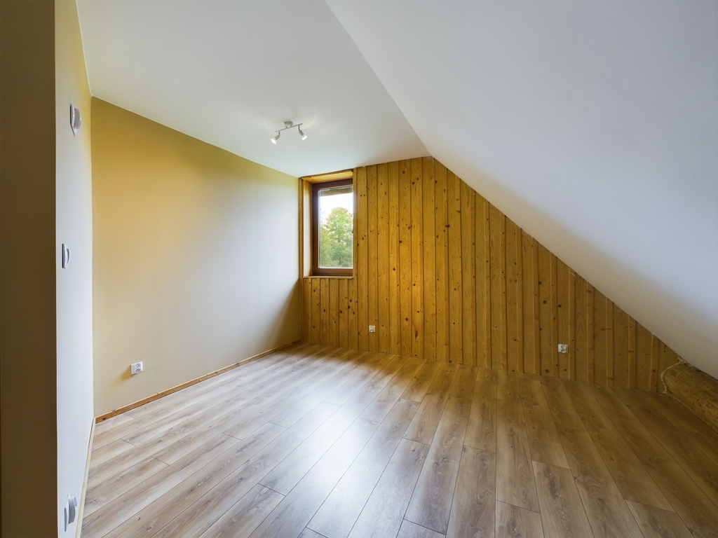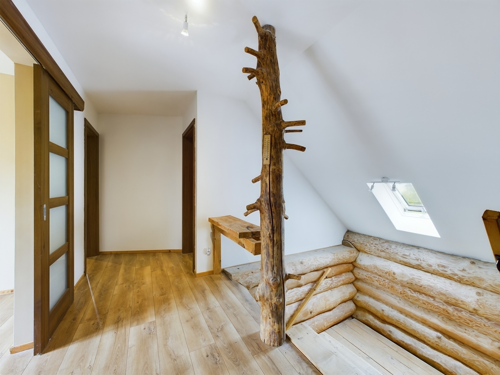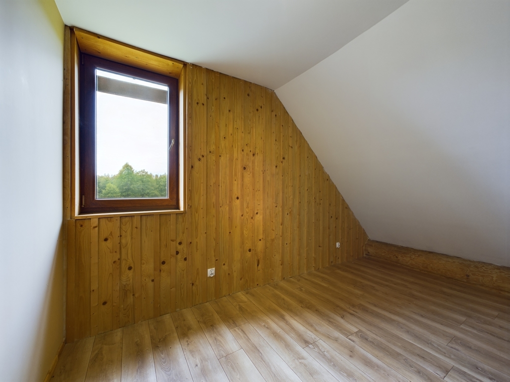 Poddasze, to salon z balkonem oraz 3 sypialnie. Przestrzeń na tym poziomie dopełniona jest garderobą, dużą łazienką z wanną, stylowym, nawiązującym do naturalnego otoczenia korytarzem oraz dla udogodnienia dodatkową toaletą.