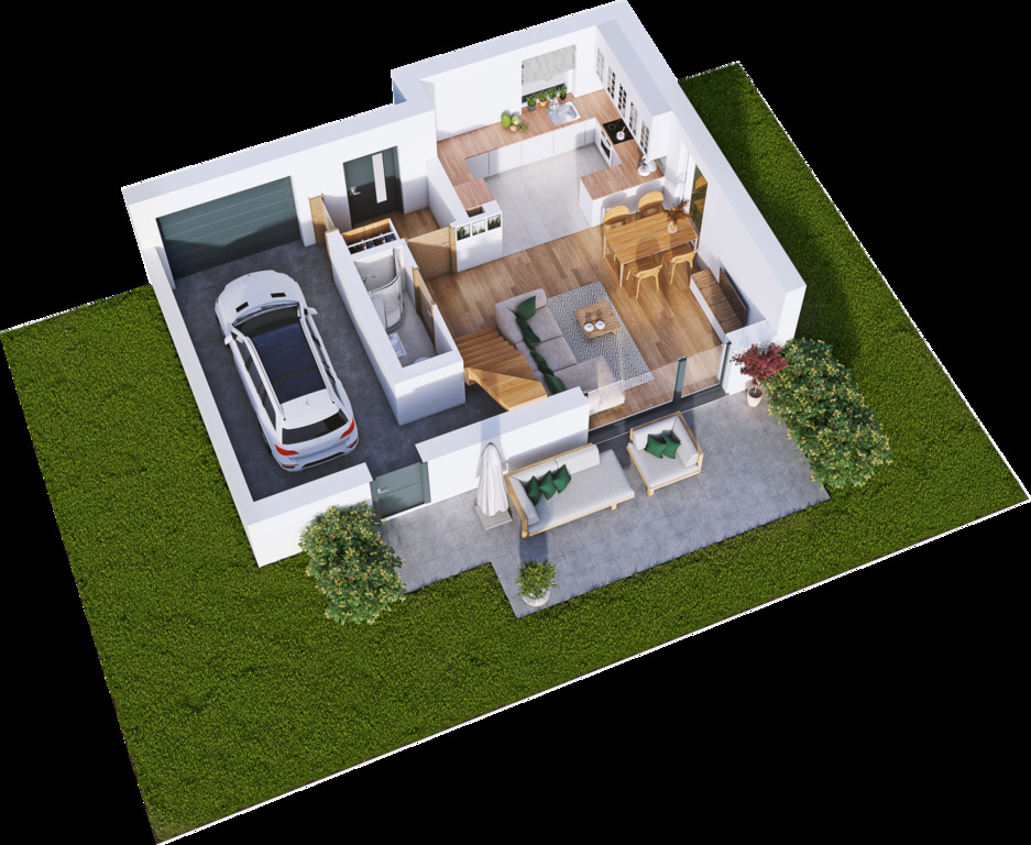 Parter: garaż, salon z kuchnią, wc, korytarz i klatka schodowa.