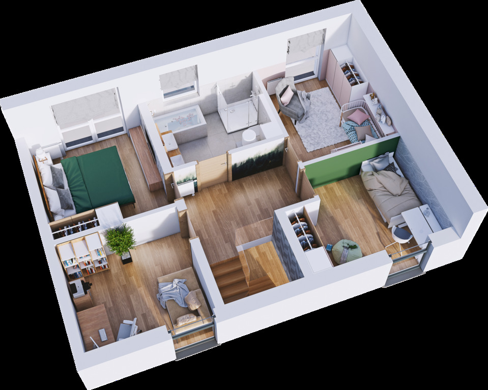 Przedstawione wizualizacje i grafiki mają charakter wyłącznie poglądowy i stanowią wyłącznie materiał pomocniczy, ułatwiający zorientowanie się w ogólnym wyglądzie oferowanej nieruchomości.