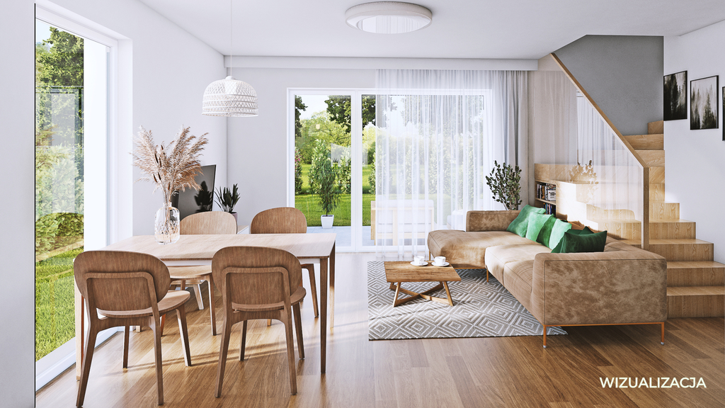 * Część dzienna z bezpośrednim wyjściem przez przeszklone drzwi typu HS na taras.
