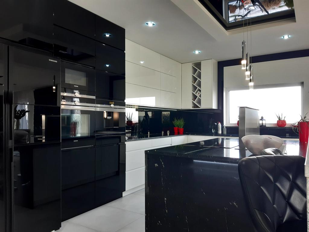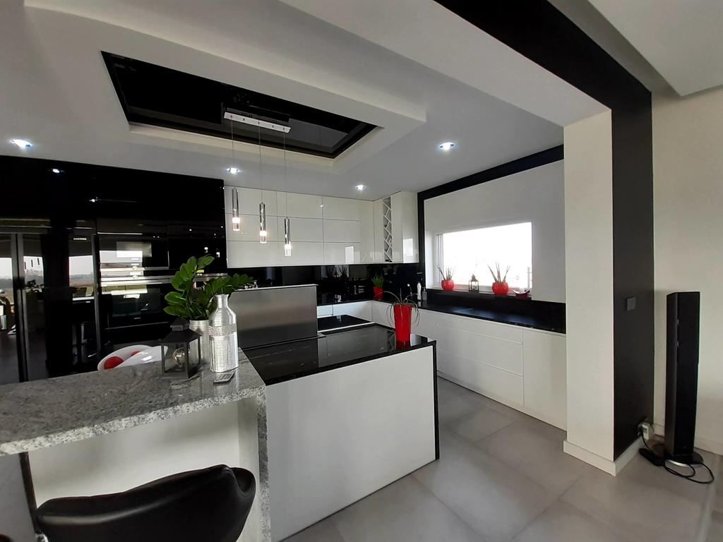 Otwarta kuchnia wyposażona jest w nowoczesny sprzęt AGD najwyższej jakości, zmywarkę, piekarnik, kuchenkę mikrofalową, płytę indukcyjną, ekspres do kawy, podwójną lodówkę z kostkarką do lodu. Wszystkie blaty kuchenne wykonane są z granitu, okap kuchenny jest wysuwany z poziomu płyty grzewczej.