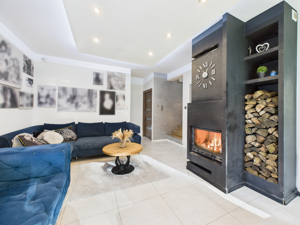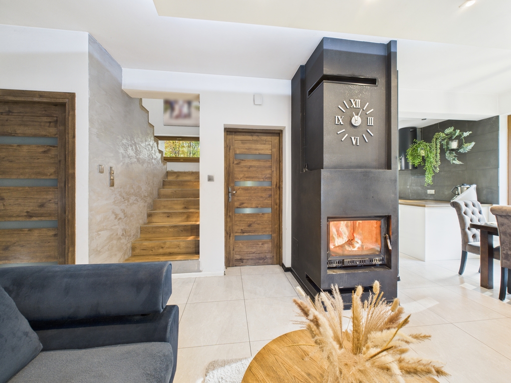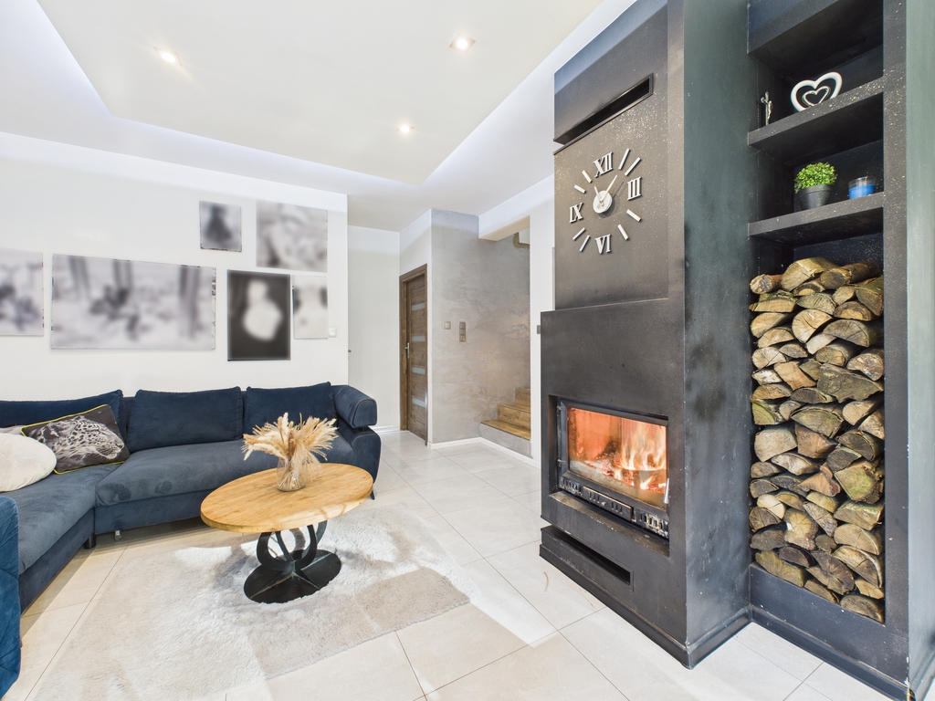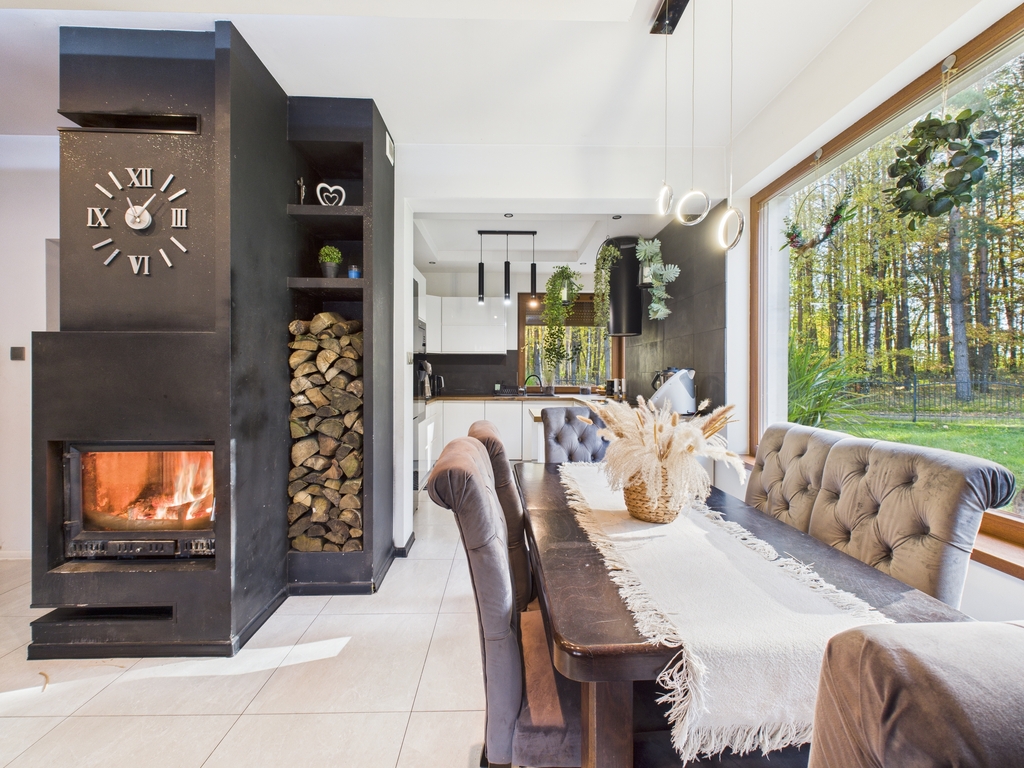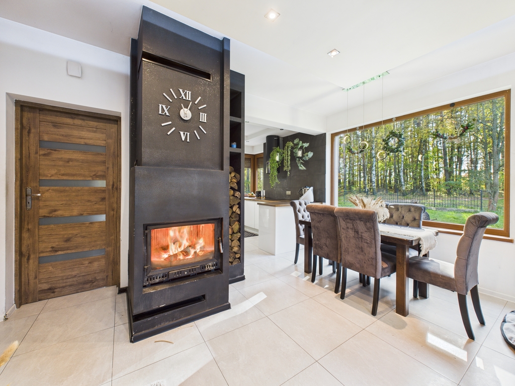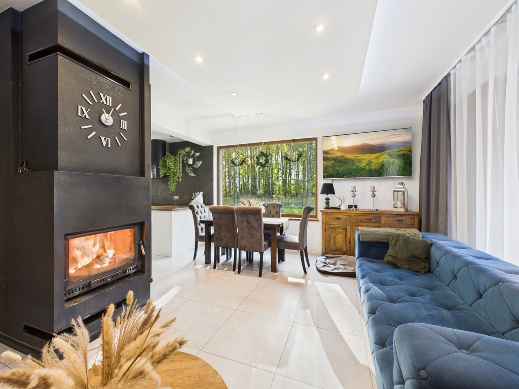 Strefa dzienna o dużej powierzchni, wyposażona w kominek. Dom posiada ogrzewanie podłogowe.