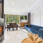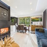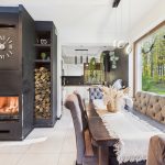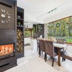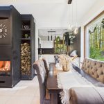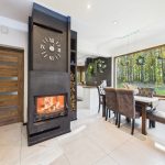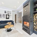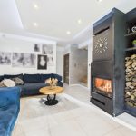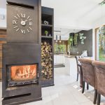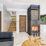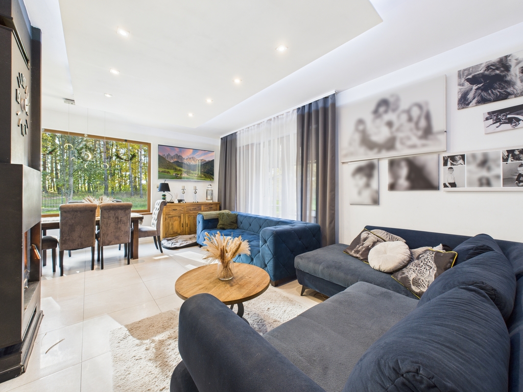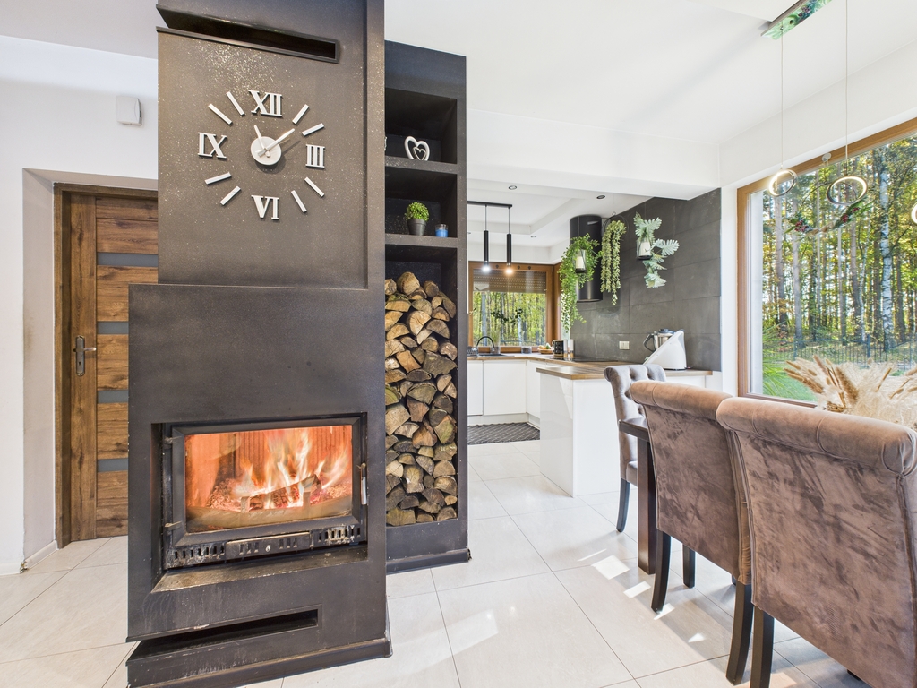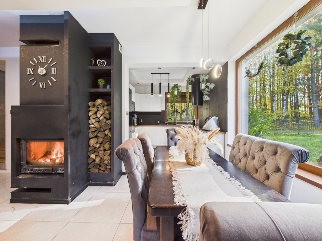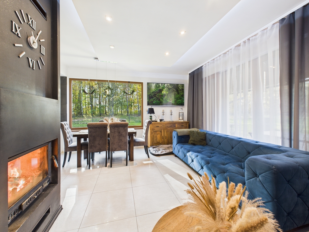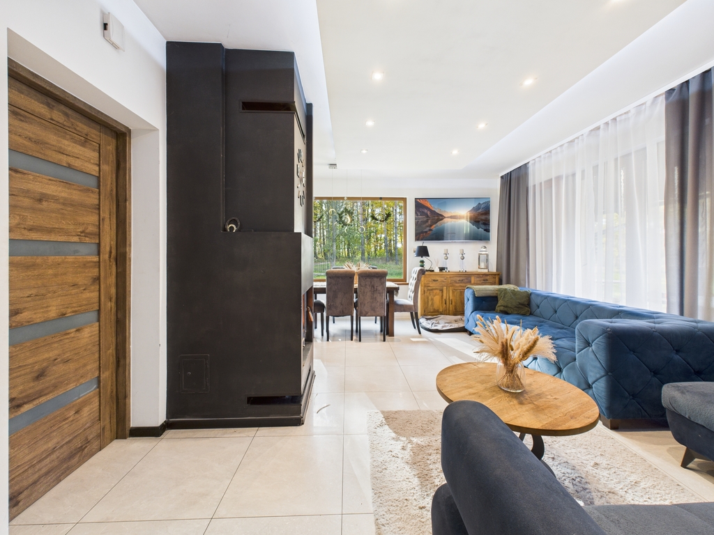 Strefa dzienna o dużej powierzchni, wyposażona w kominek. Dom posiada ogrzewanie podłogowe.