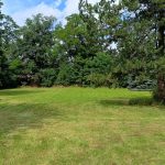- Działka ogrodzona z nasadzeniami krzewów i drzew ozdobnych oraz owocowych.