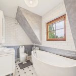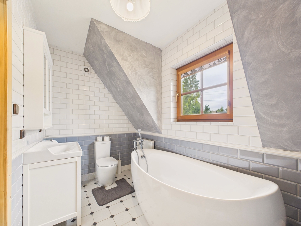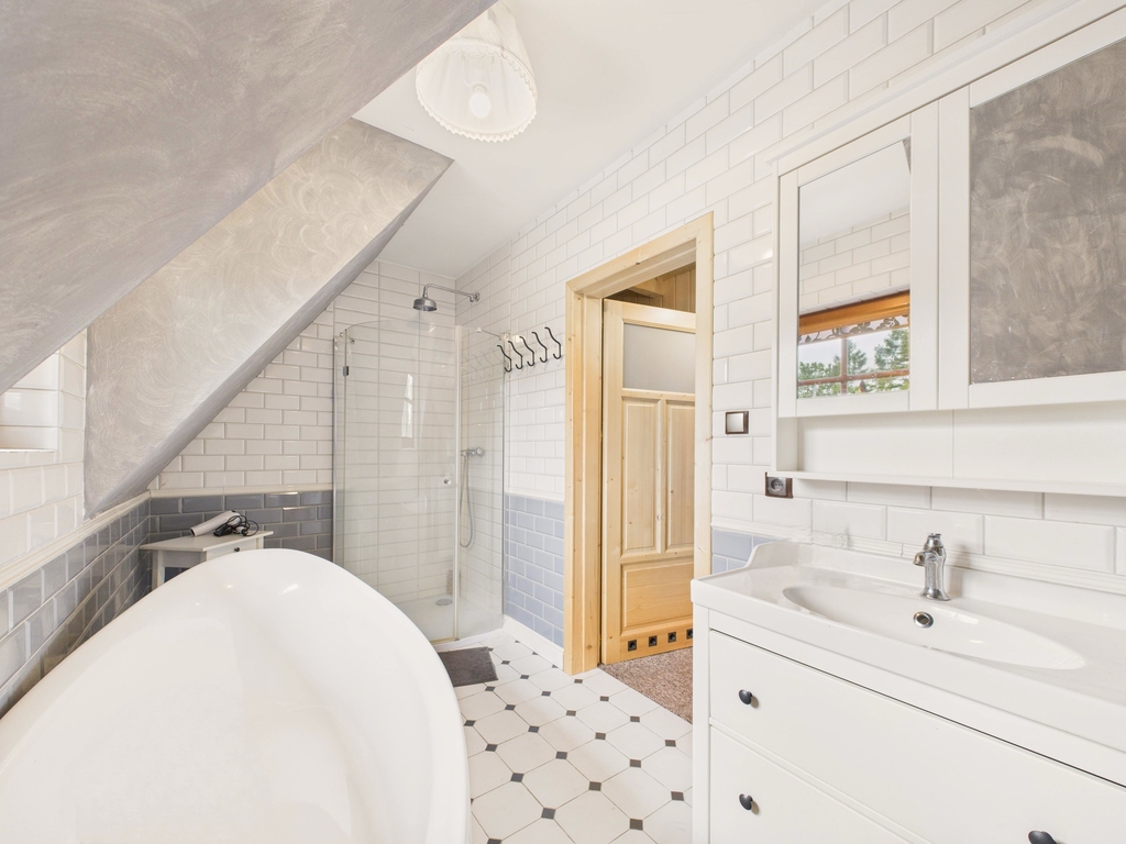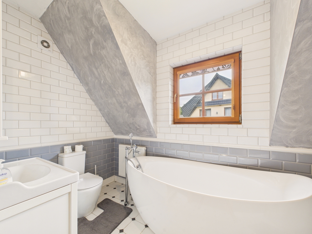 - elegancka łazienka z wanną wolnostojącą i prysznicem,