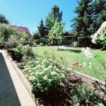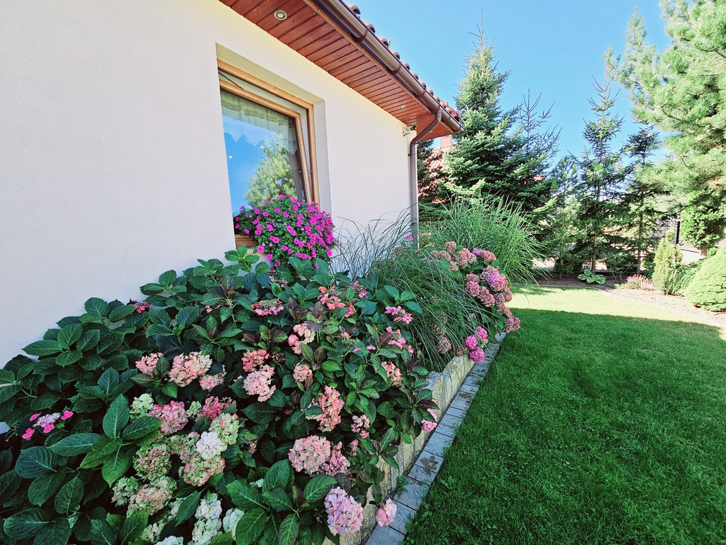 -Piękny zagospodarowany ogród z nawadnianiem kropelkowym roślin.