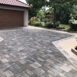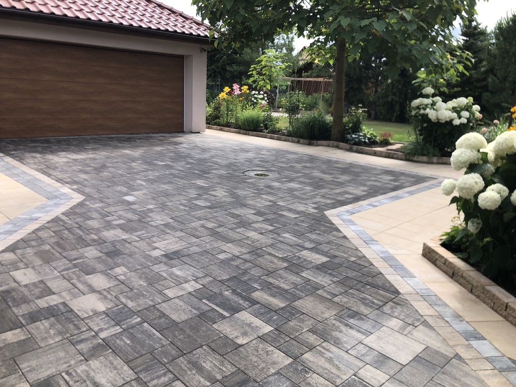 -Ogrodzenie betonowe w nowoczesnym stylu, podjazd i opaska wokół domu oraz ogrodu wybrukowana,