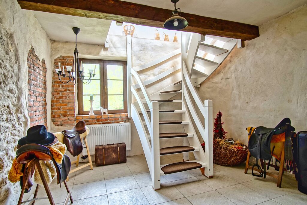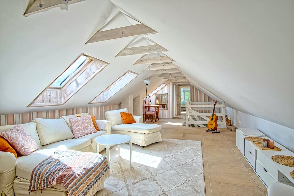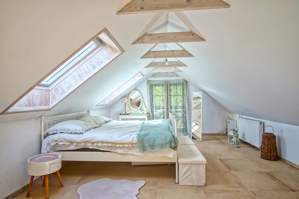 • Widoczne drewniane krokwie i przestrzeń o wyjątkowym klimacie