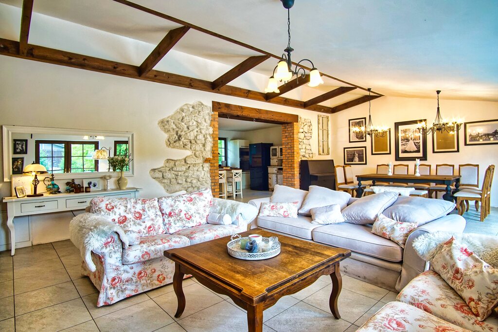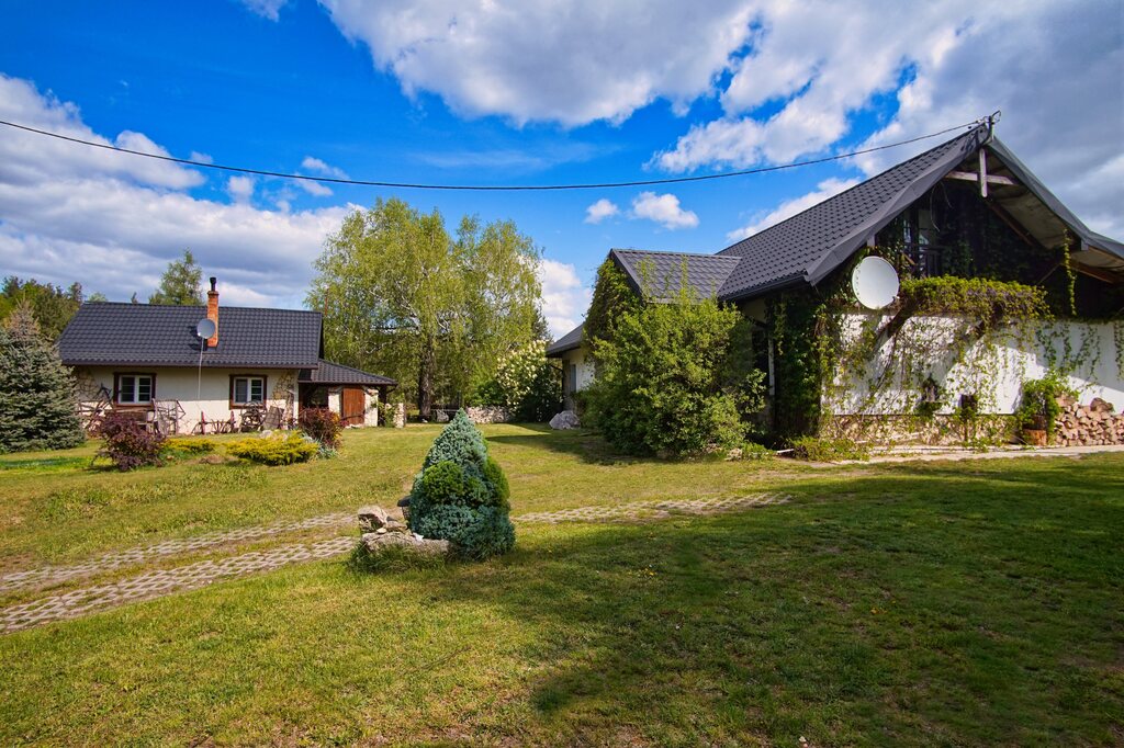 Główny dom (po rozbudowie i remoncie w 2024 r.) zachwyca przestrzenią i stylem nawiązującym do tradycyjnych polskich dworków: drewniane belki, rustykalna kuchnia, kominek, kamień na ścianach i panoramiczne przeszklenia z widokiem na las.
