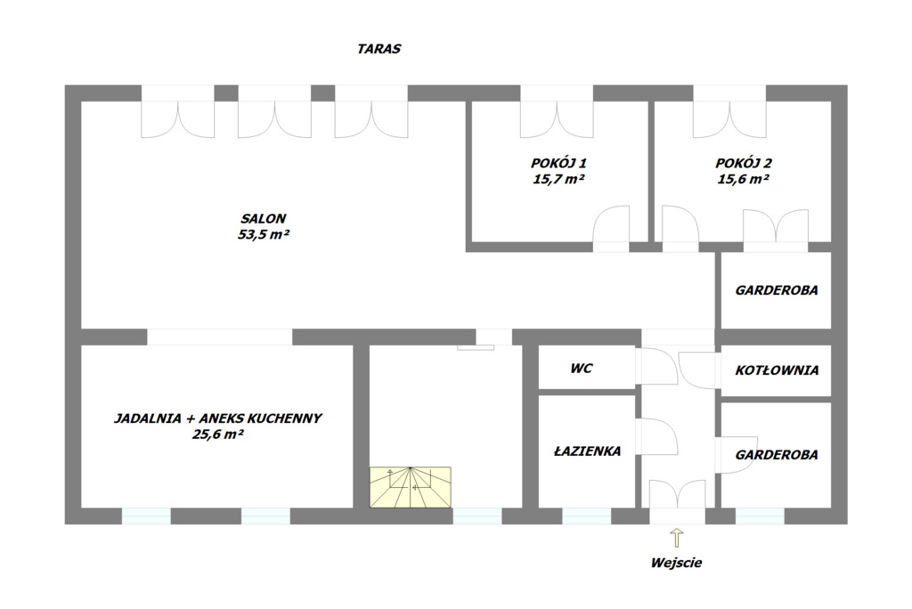 Parter: kuchnia z jadalnią, pokój, łazienka