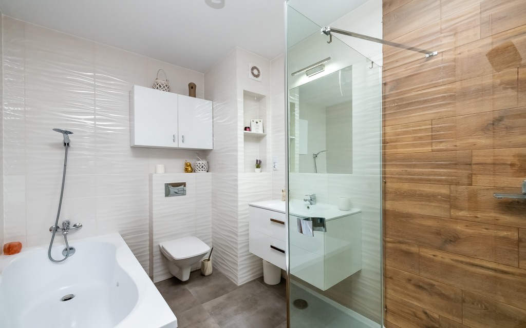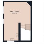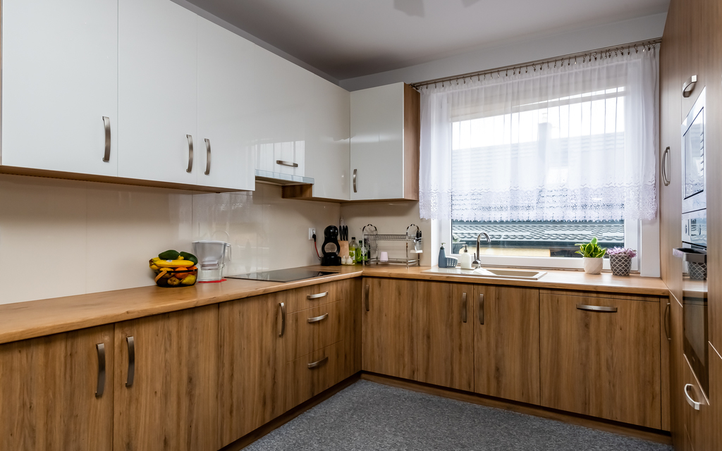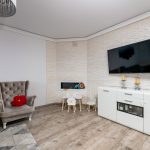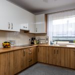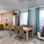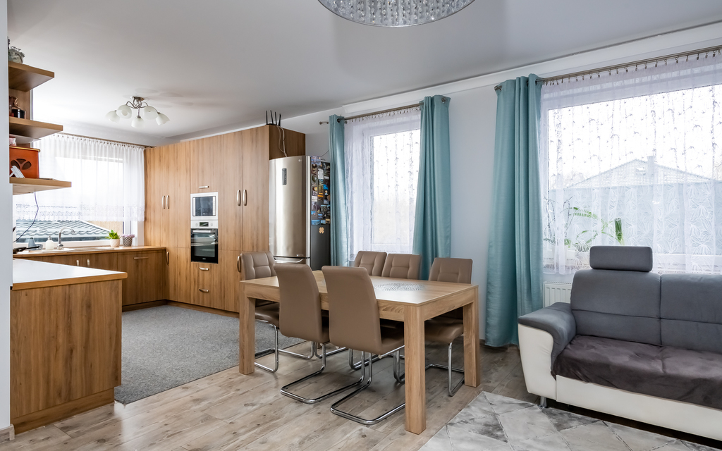 41,4 m² oferuje przestronny salon połączony z nowoczesną kuchnią wyposażoną w stałą zabudowę. To miejsce, gdzie domownicy mogą spędzać wspólne chwile, ciesząc się komfortem i wygodą.