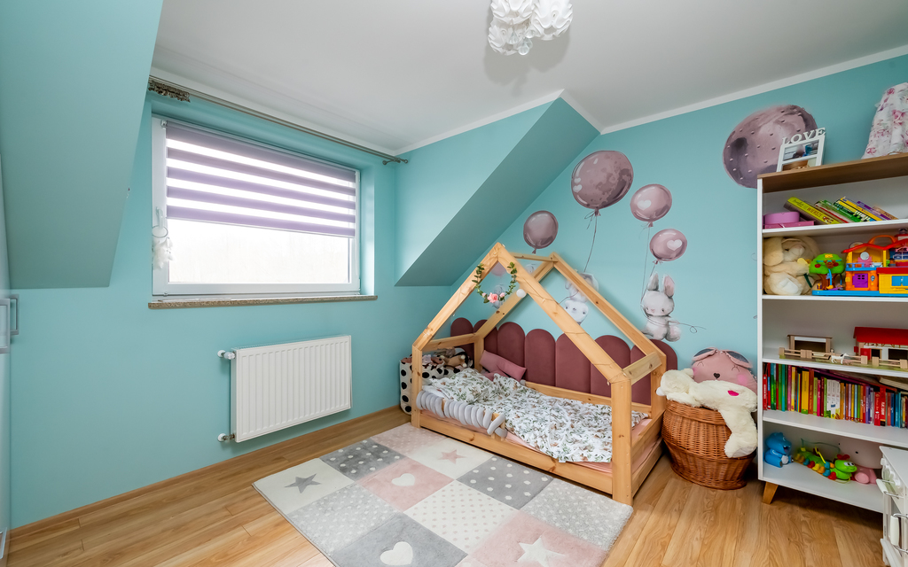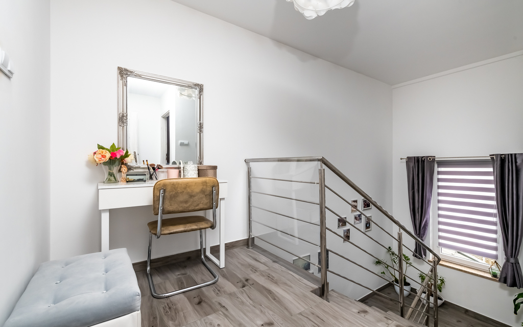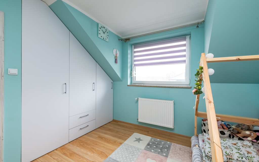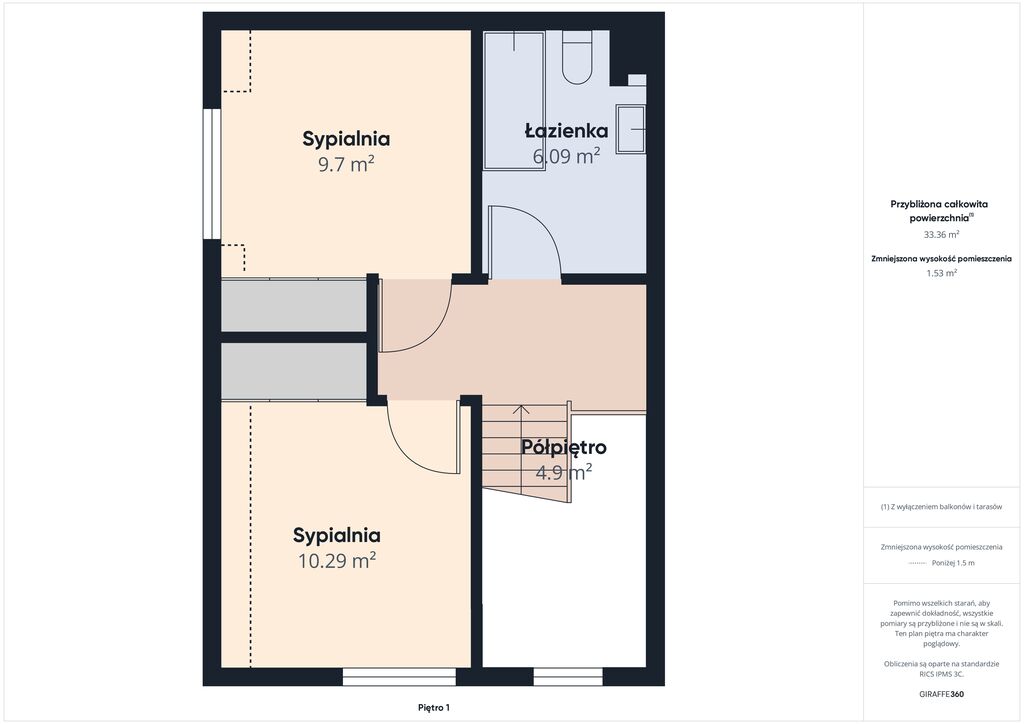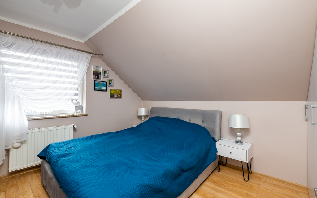 35,08 m², znajdują się dwie oddzielne, jasne sypialnie oraz funkcjonalna łazienka. Dodatkowo, na tym poziomie umieszczone jest wejście na wysokie poddasze, które służy jako praktyczny składzik.