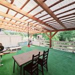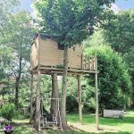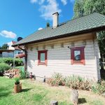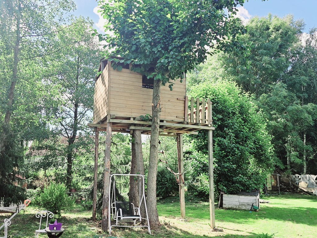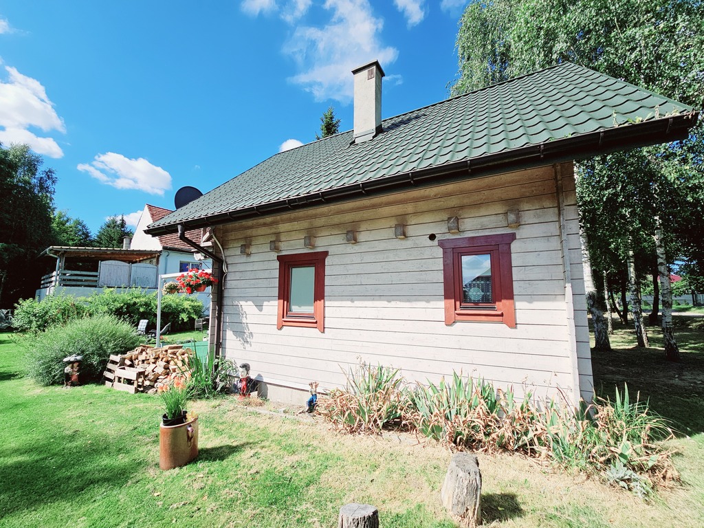 Urokliwy ogród z drewnianym domkiem letniskowym, który ma przytulne wnętrze i werandę, idealne miejsce na poranną kawę lub wieczorne grillowanie.