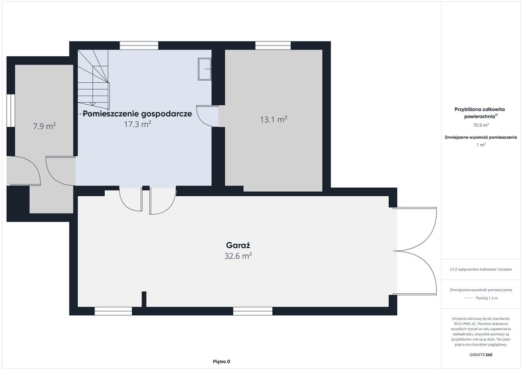 - 3 pomieszczenia gospodarcze (17,30m2, 13,10m2, 7,90m2)