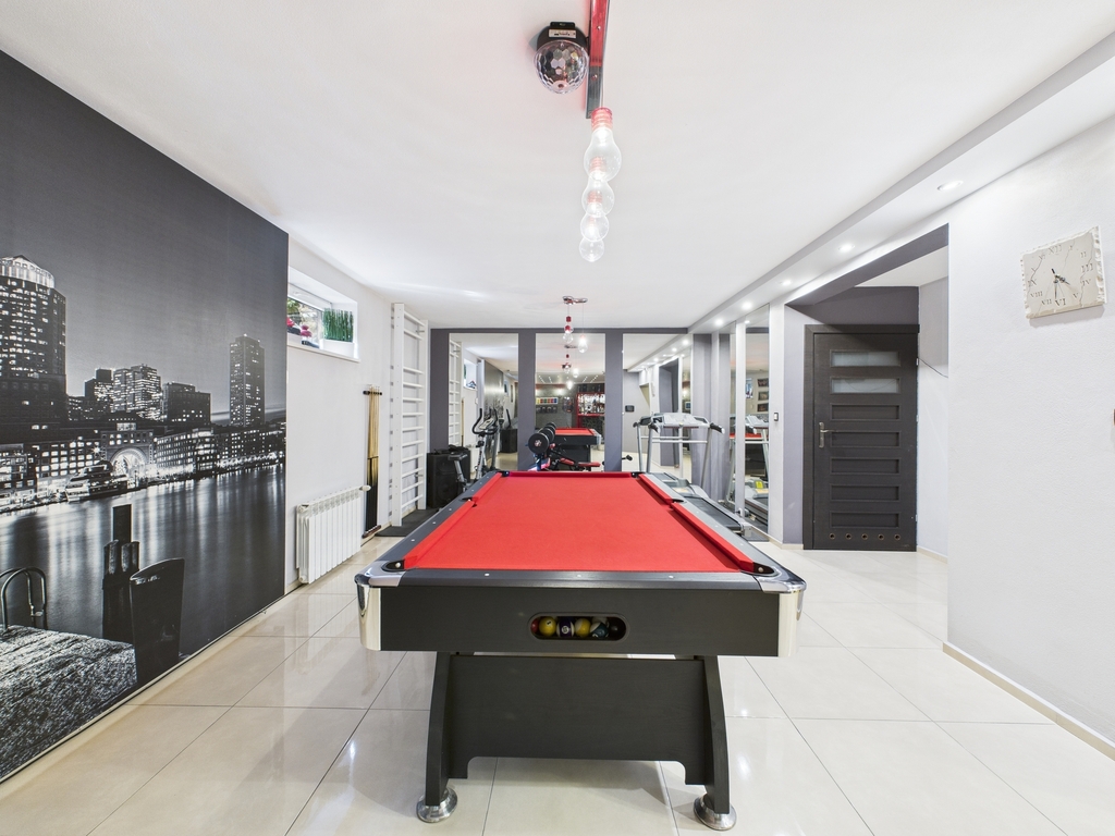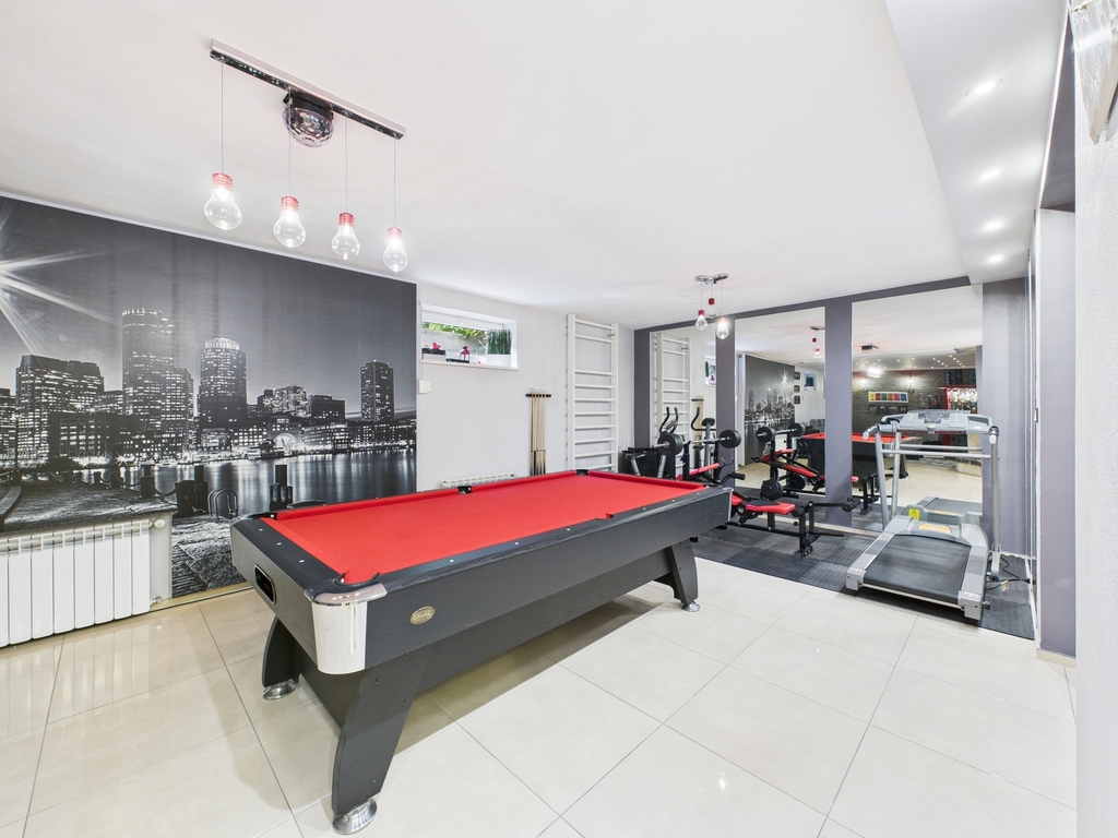 Posiada ogrzewanie podłogowe, dwa kominki, w tym jeden z otwartym paleniskiem, klimatyzację, alarm oraz monitoring.