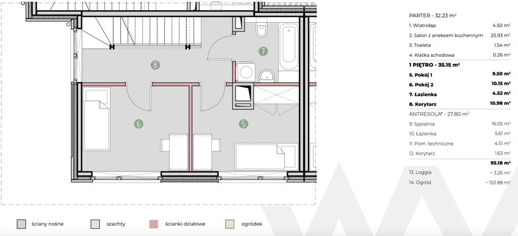 - I piętro (35,2 m²): dwa pokoje (9,5 m² i 10,2 m²), łazienka, korytarz.