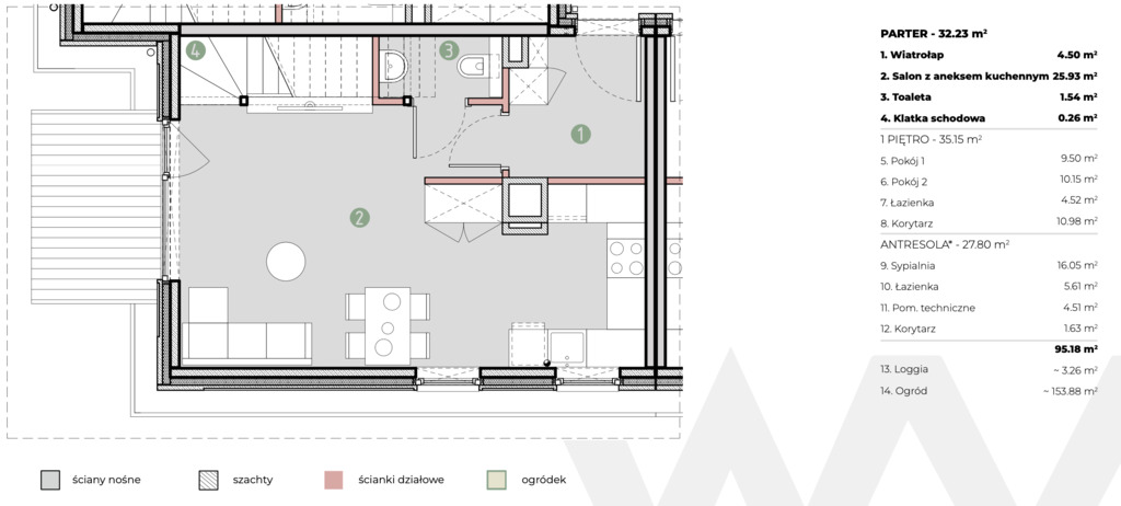 Rozkład pomieszczeń: - Parter (32,2 m²): salon z aneksem kuchennym (25,9 m²), toaleta, wiatrołap, klatka schodowa.
