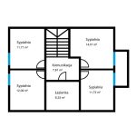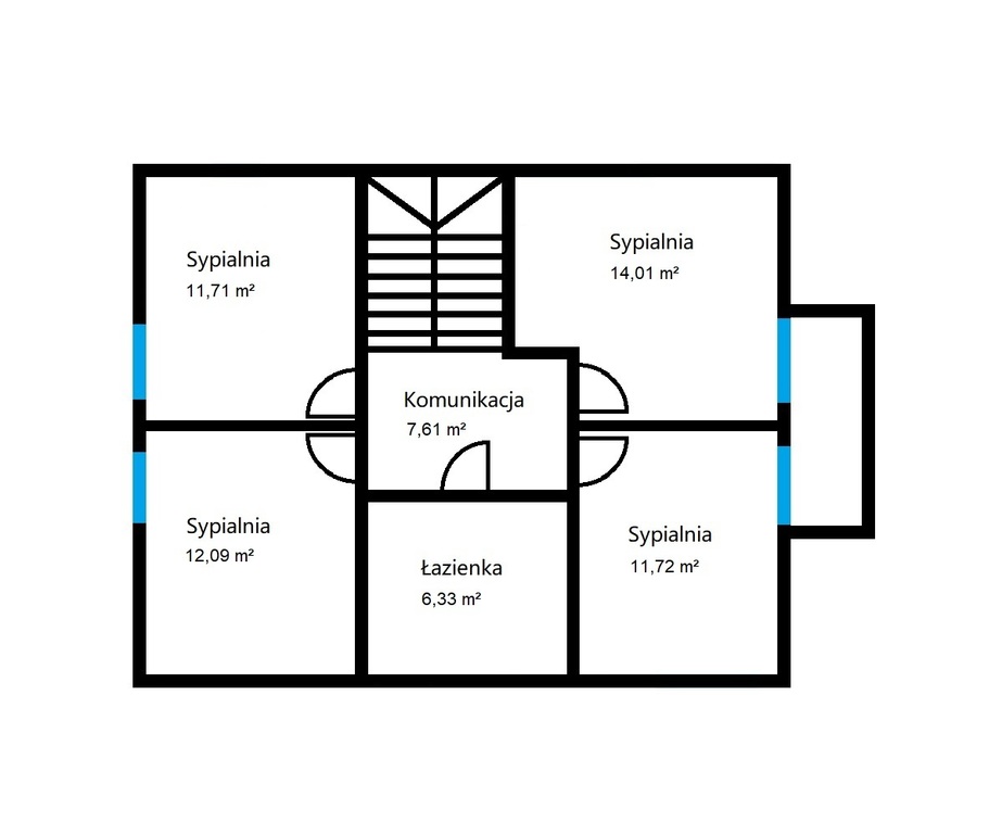 Na piętrze o powierzchni 63,47 m2 znajdują się cztery sypialnie ( 11,71 m2; 12,09 m2; 14,01 m2; 11,72 m2) oraz łazienka - 6,33 m2 i przedpokój 7,61 m2.