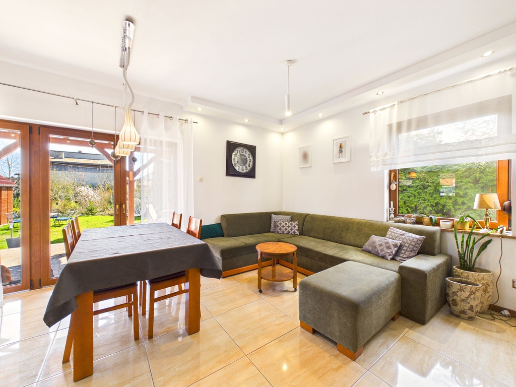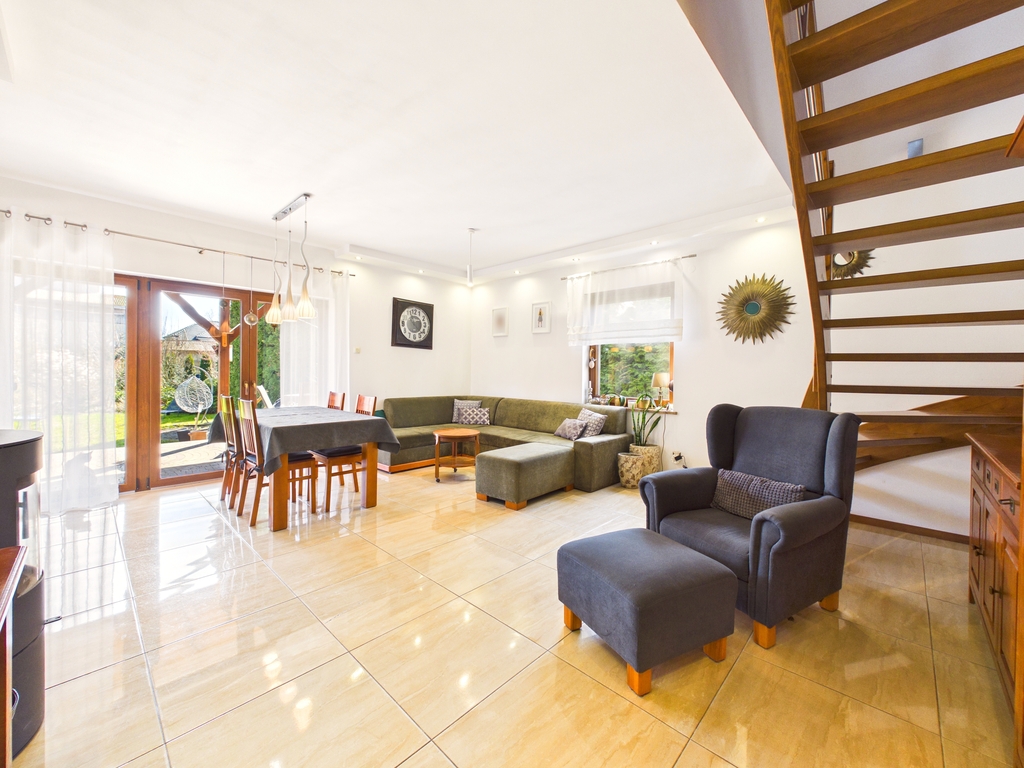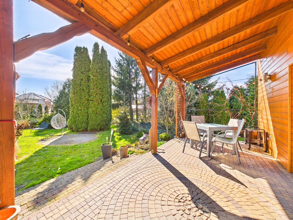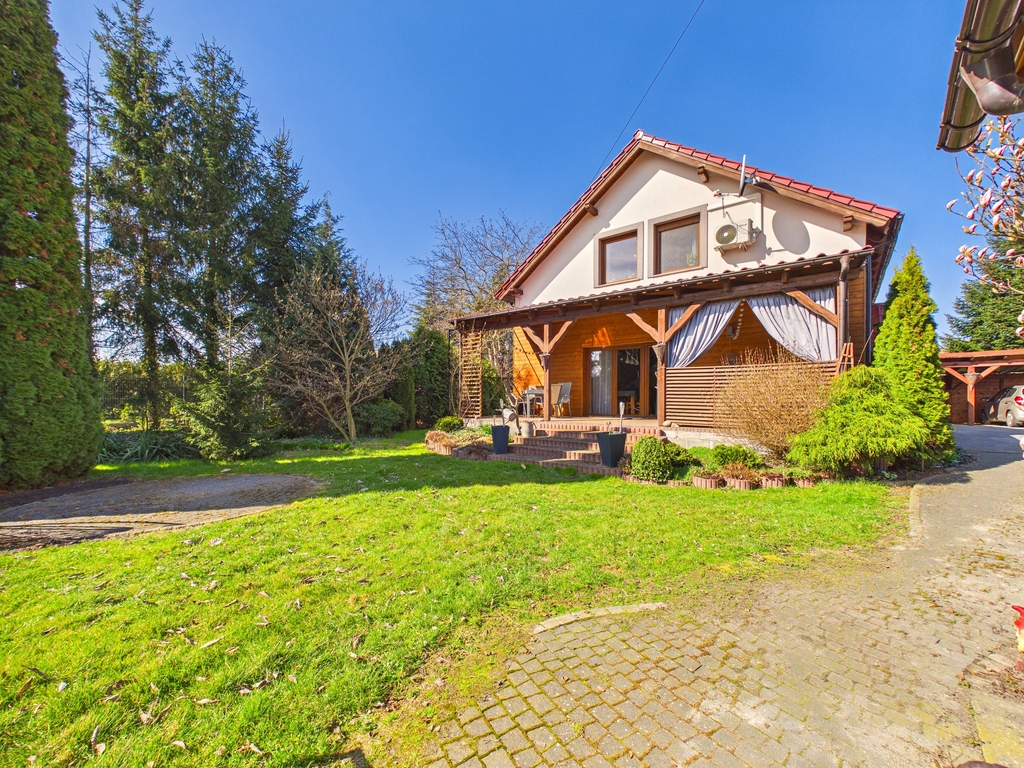 dużą działką i zadbanym ogrodem. Funkcjonalny układ pomieszczeń oraz nowoczesne rozwiązania, takie jak pompa ciepła i klimatyzacja,