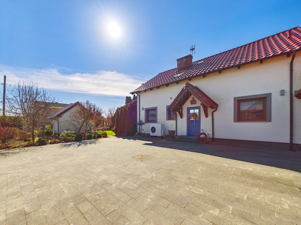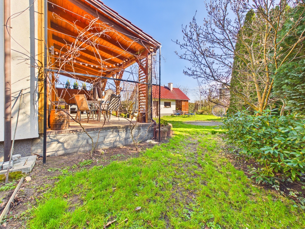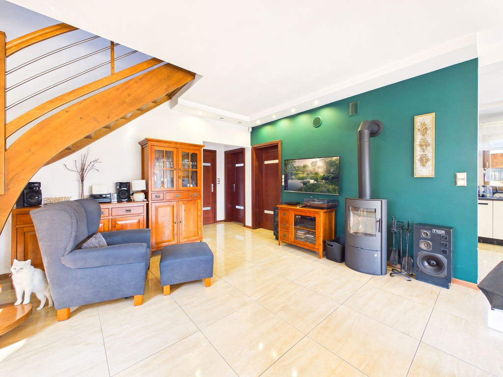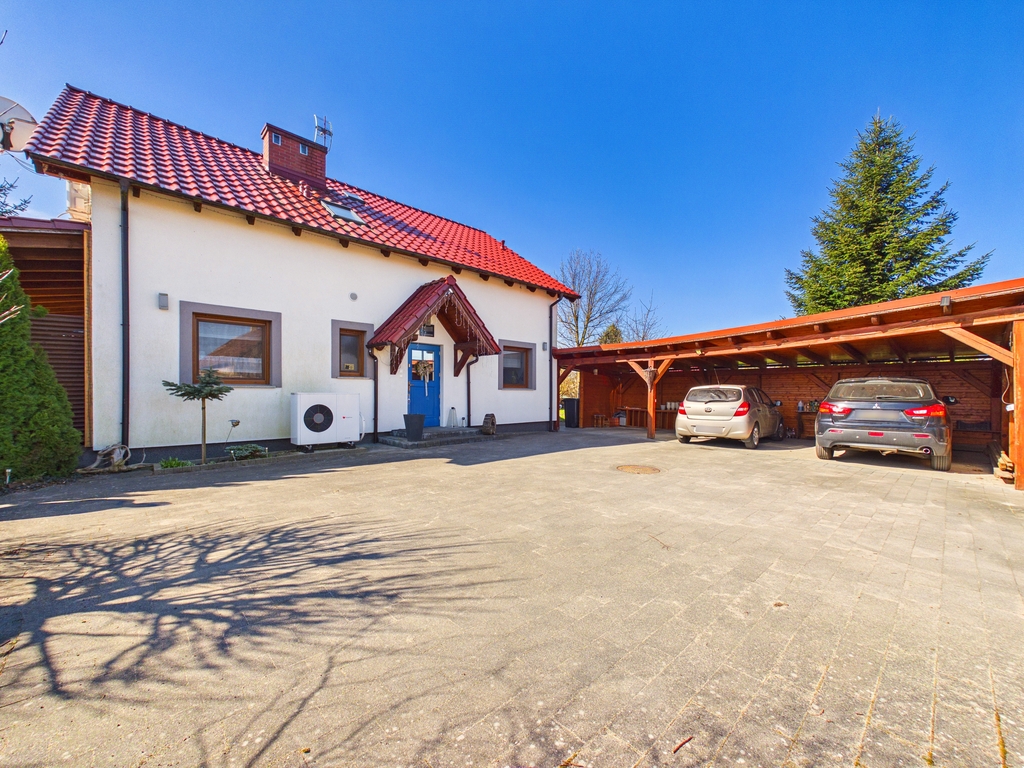 dużą działką i zadbanym ogrodem. Funkcjonalny układ pomieszczeń oraz nowoczesne rozwiązania, takie jak pompa ciepła i klimatyzacja,